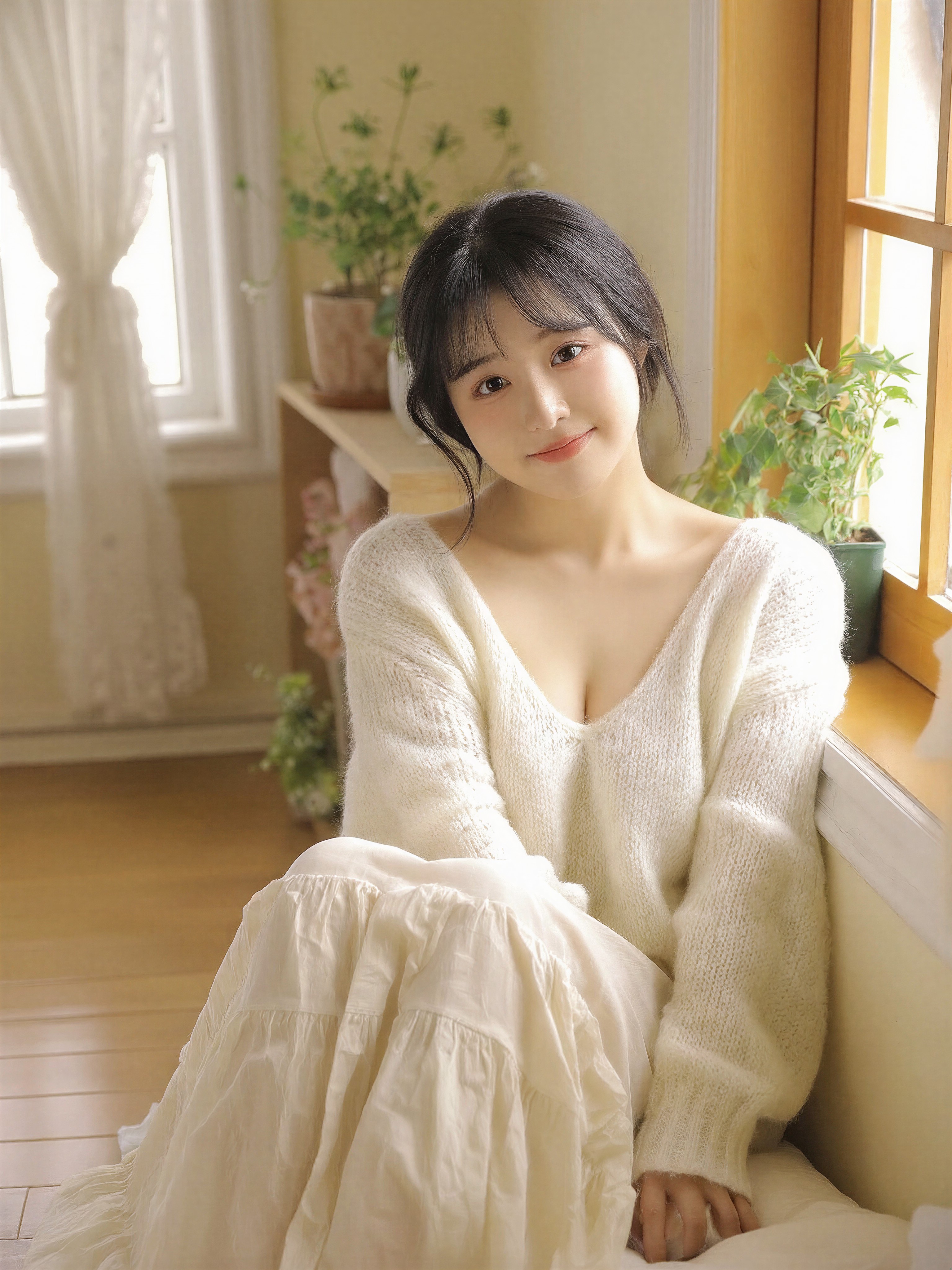 Cute sweet girl with a very kind face, soft smile, and large natural bust. She is wearing a cozy oversized white knitted sweater and a long skirt. Sitting on a windowsill in a bright, airy bedroom. Background: morning sunlight, potted plants, white curtains, wooden floor. Warm, gentle, romantic home atmosphere. High quality photo, soft focus, adorable.
