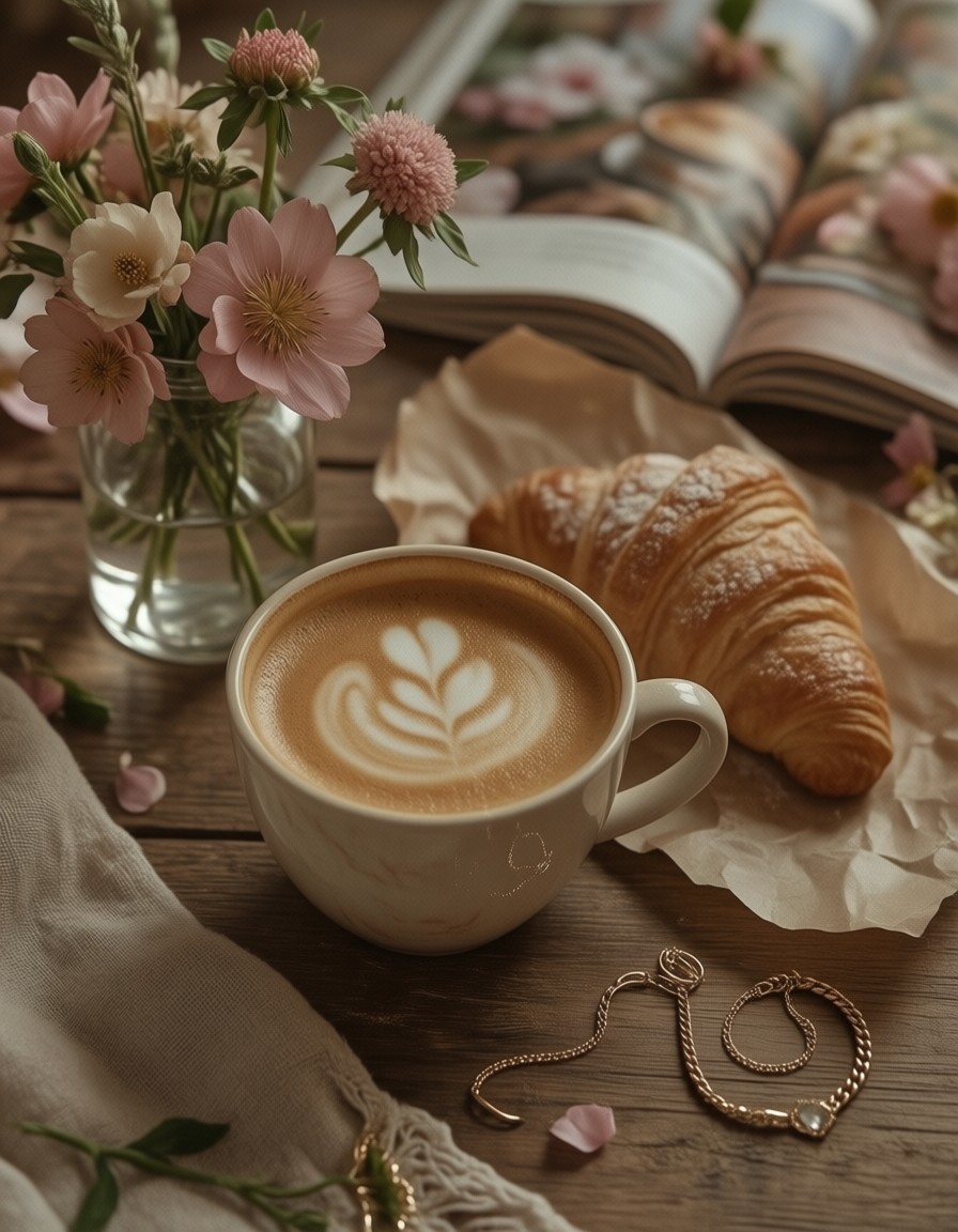 Instagram Aesthetic. A flat lay composition on a warm wooden table: a half-empty latte with delicate foam art, a croissant on parchment paper, fresh flowers in a small glass vase, an open magazine with soft focus, gold jewelry casually placed, warm natural lighting from the side, soft pastel color palette of cream, blush pink, and sage green, cozy morning mood, aspirational lifestyle photography