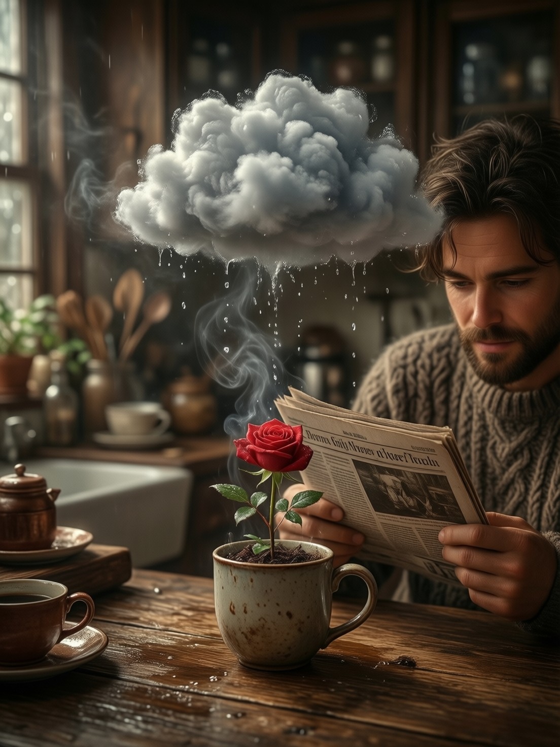 Magical Realism, a realistic photo of a cozy, dimly lit vintage kitchen. A man in a knitted sweater is sitting at a wooden table, reading a newspaper. Above his coffee mug, a small, fluffy, hyper-realistic rain cloud is hovering, gently watering a single tiny red rose growing directly out of the ceramic cup. Soft volumetric lighting, realistic steam and water droplets, moody and intimate atmosphere, textures of aged wood and soft wool, 35mm film aesthetic.
