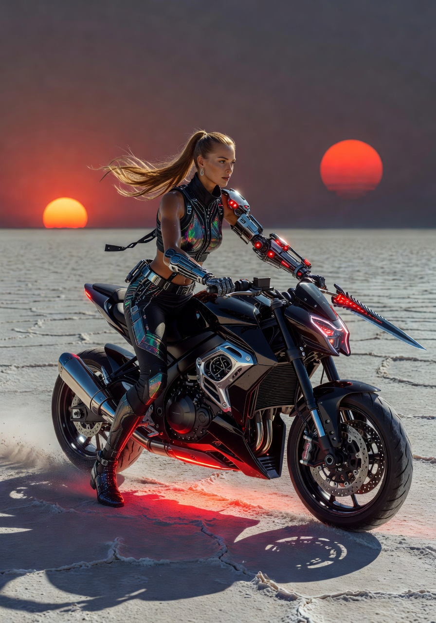 Cyberpunk Style, dynamic Fashion Photography pose. A full-body shot of a slender woman with a long honey-blonde ponytail and armored technical clothing. She is confidently riding a sleek black hover-motorcycle with detailed chrome accents and vibrant neon red underglow. A formidable mechanical combat blade is integrated into her augmented right arm. She streaks across the expanse of a vast, cracked dry salt lake bed against the dramatic backdrop of two setting suns. Hard directional sunlight creating sharp fashion shadows, glistening metallic surfaces, wide-angle lens, cinematic composition, hyper-detailed textures, 8k resolution.