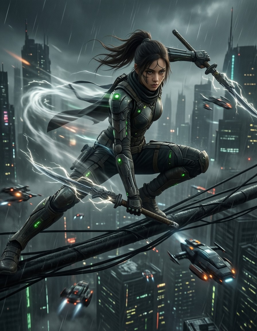Cyberpunk style, a dynamic full-body shot of a female cyborg ninja standing on a rooftop, holding a single-edged plasma katana that crackles with white energy. Below, a neon-lit cyberpunk ramen shop corner with rain streaks. High contrast, atmospheric perspective, 8k render, Unreal Engine style, masterpiece of action composition