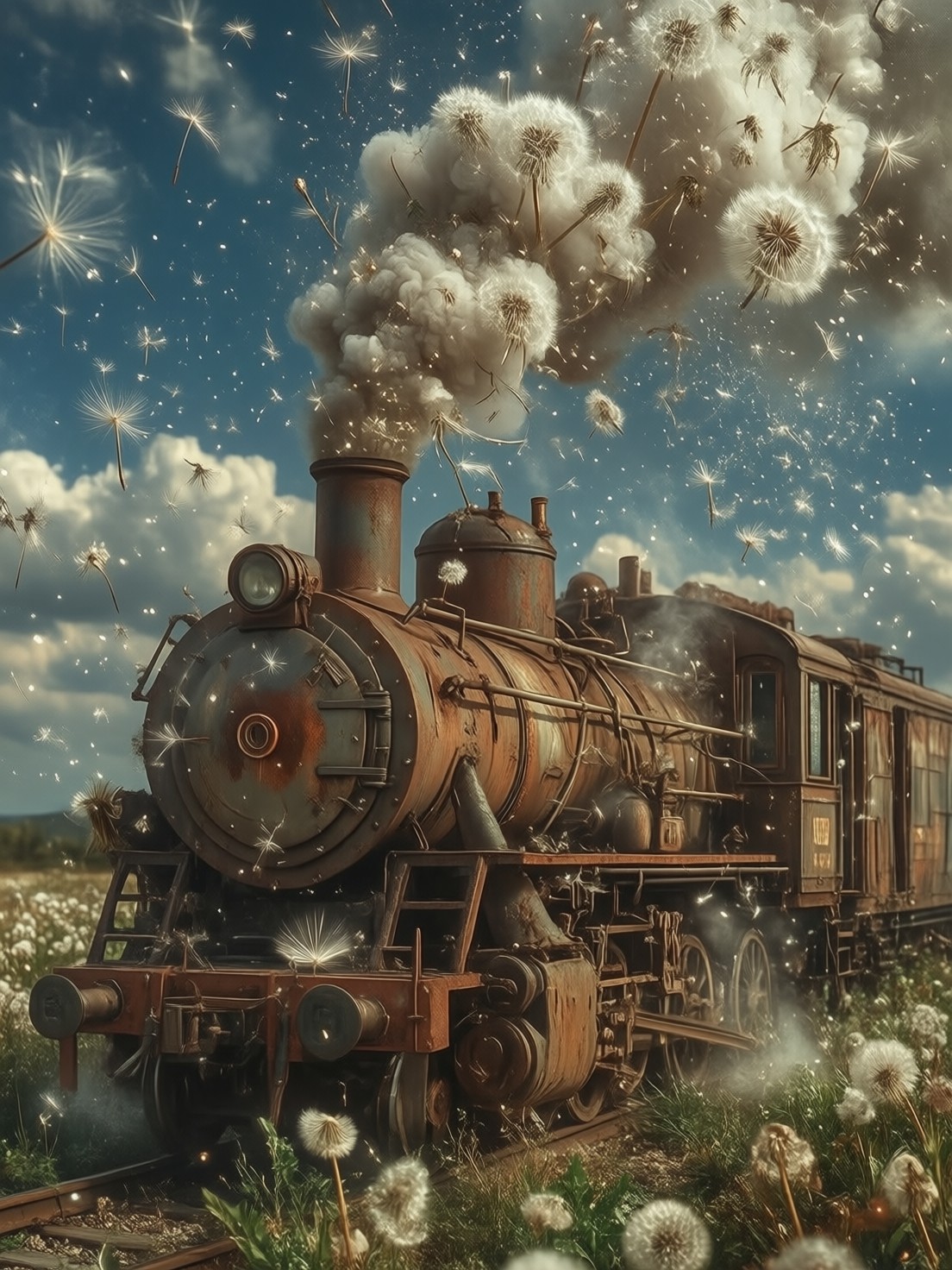 Magical Realism, a realistic photo of an old, rusty train car parked in an ordinary field. Instead of smoke, thousands of fluffy white dandelion seeds blow out of its chimney, forming a solid white trail across the blue sky. Natural daylight, sharp focus on the dandelion seeds, authentic textures of rust and soft fluff, poetic and surreal vibe, 35mm film aesthetic.