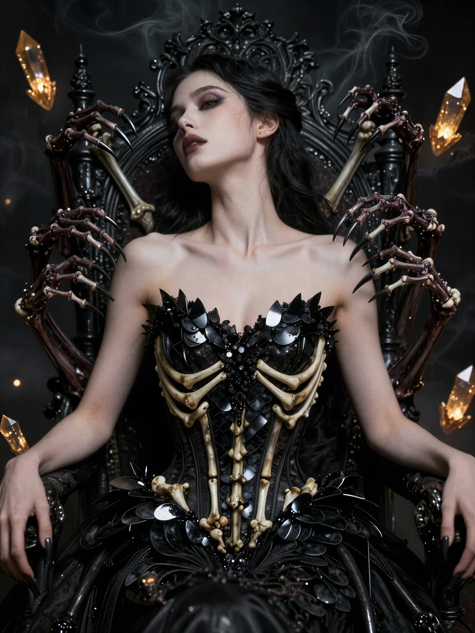 Gothic Horror Photography, a stunning close-up of a woman whose dress is slowly transforming into a demonic entity. The bodice of her gown is made of interlocking blackened bones and obsidian scales. Several gnarled, skeletal demonic hands with razor-sharp talons emerge from her own back, arching over her shoulders like a macabre throne. She has a serene, regal expression, her head tilted back slightly. The background is a void of swirling black smoke and floating, glowing amber crystals. Cinematic lighting, sharp focus on the contrast between smooth skin and rugged bone textures, 8k, Fashion Editorial feel.