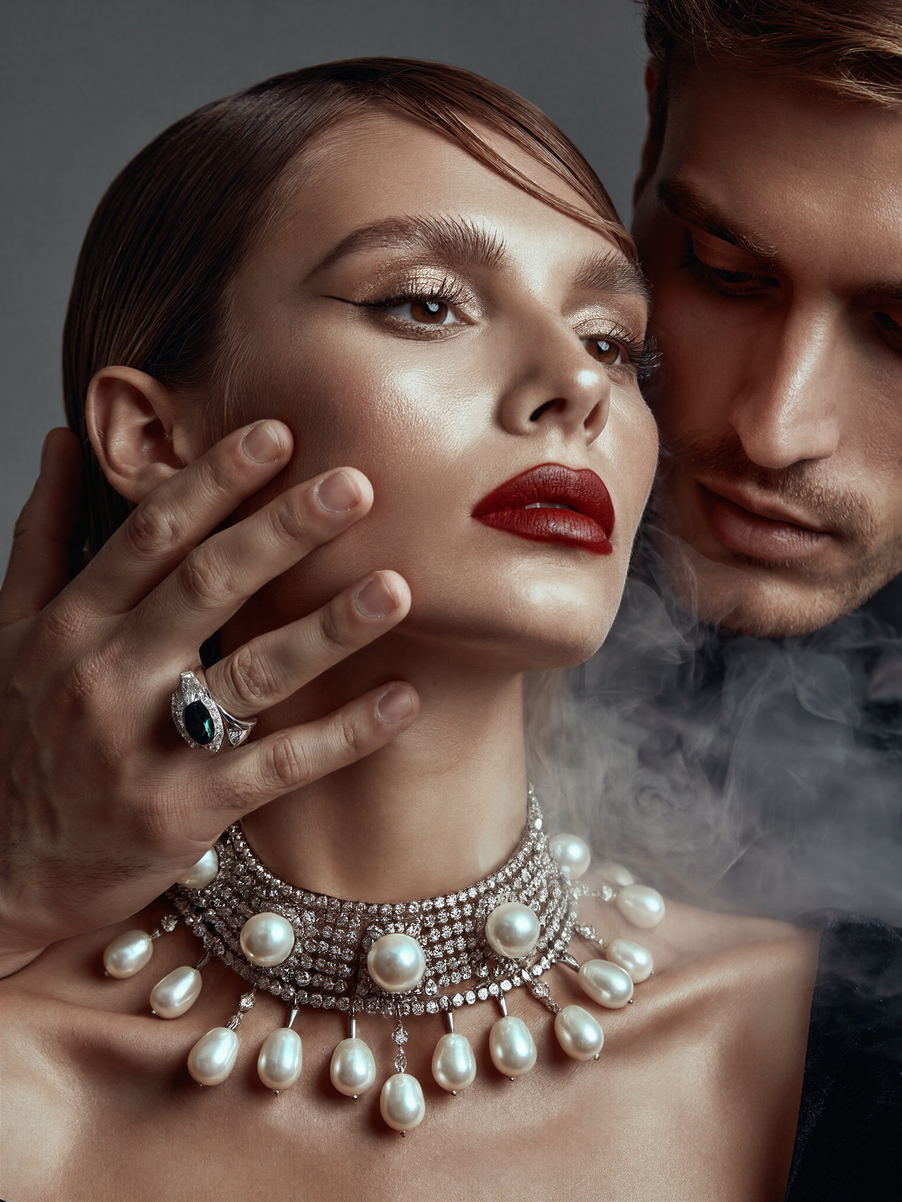 The woman's face is a study in contradictions: hyper-realistic skin textures catch the moody light like wet marble, yet her eyes hold the stillness of a silent film star. The volumetric fog swirls in the background, but the focus is razor-sharp on her pearl and diamond choker — each facet of the gemstones catching the light in a way that makes them seem alive. The man's hand, adorned with a massive ring, hovers near her cheek, the blurred background hinting at a world where cinematic tension meets intimate glamour.