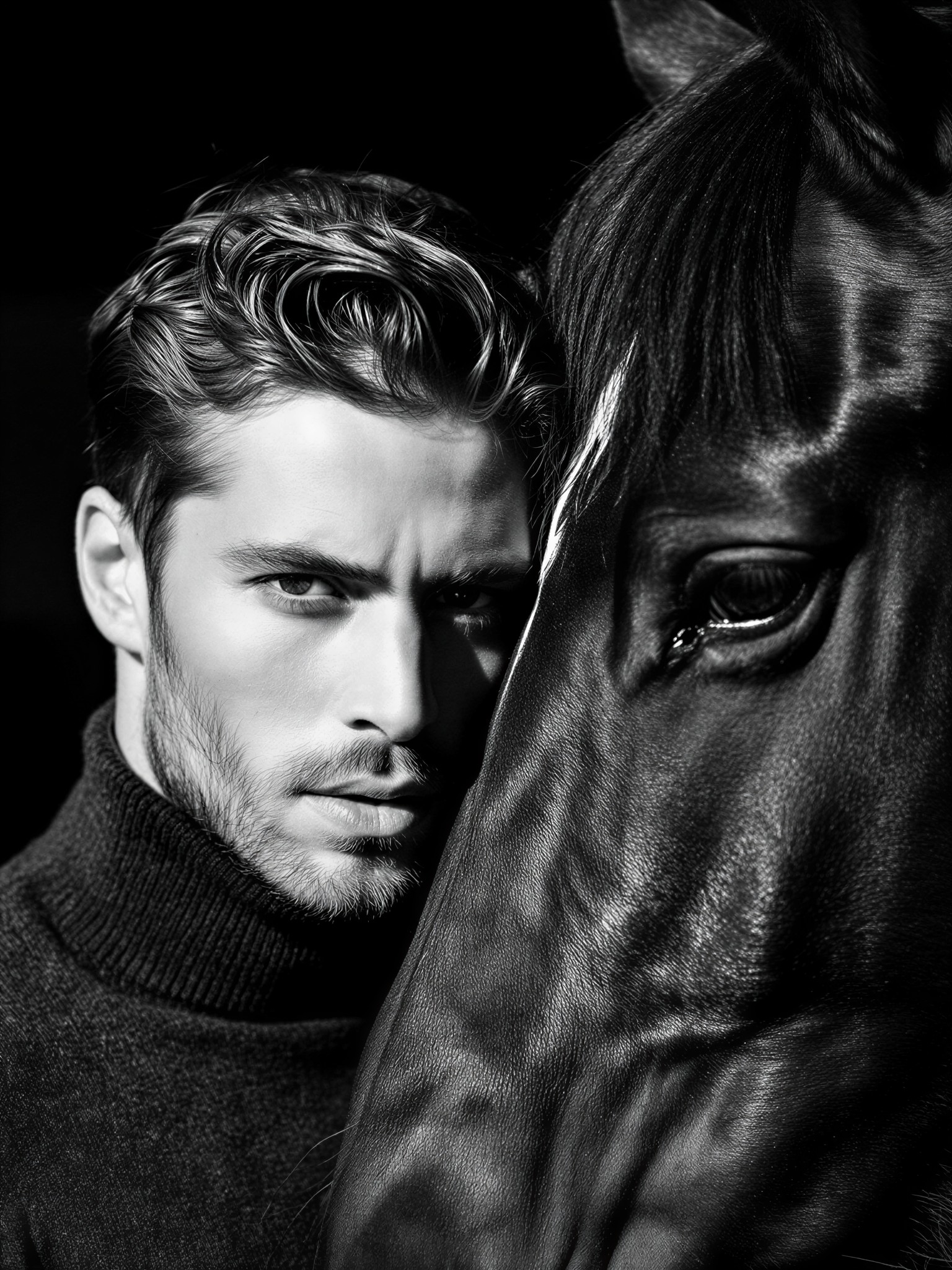 Fine Art Photography, a powerful, close-up monochrome (black and white) portrait of a strikingly handsome man, approximately 30 years old, with defined features, dark messy hair, and visible light stubble. He is leaning his forehead gently against the velvety nose of a magnificent, jet-black Friesian horse with a flowing mane. Both are in sharp focus. He wears a dark, textured charcoal turtleneck. The lighting is dramatic chiaroscuro from a single source, illuminating only the essential lines of his face and the horse's profile. The entire background is an absolute, void-like black blur (bokeh). Hyper-detailed skin texture, fine horse hair, emotional and artistic atmosphere, masterpiece quality, 8k resolution.