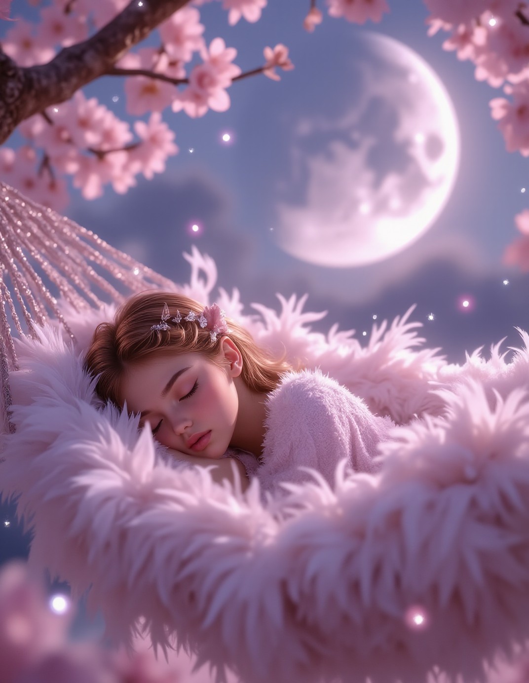 A portrait of a delicate girl sleeping peacefully in a large, ethereal hammock made entirely of soft, fluffy white and pale pink feathers. The hammock is strung between two blooming cherry blossom trees with pale pink flowers, against a background of a very large, hazy, crescent moon in a pastel indigo sky. She is wrapped in a gossamer throw blanket of pale lilac. Tiny, swirling smoke particles float in the air, catching the soft, cool moonlight. Very shallow depth of field, focused sharply on her calm expression and the texture of the feathers, with everything else in a heavy, dreamy bokeh. Palette of rose gold, soft lilac, baby white, and dusty blue. Haunting, mysterious, eerie.