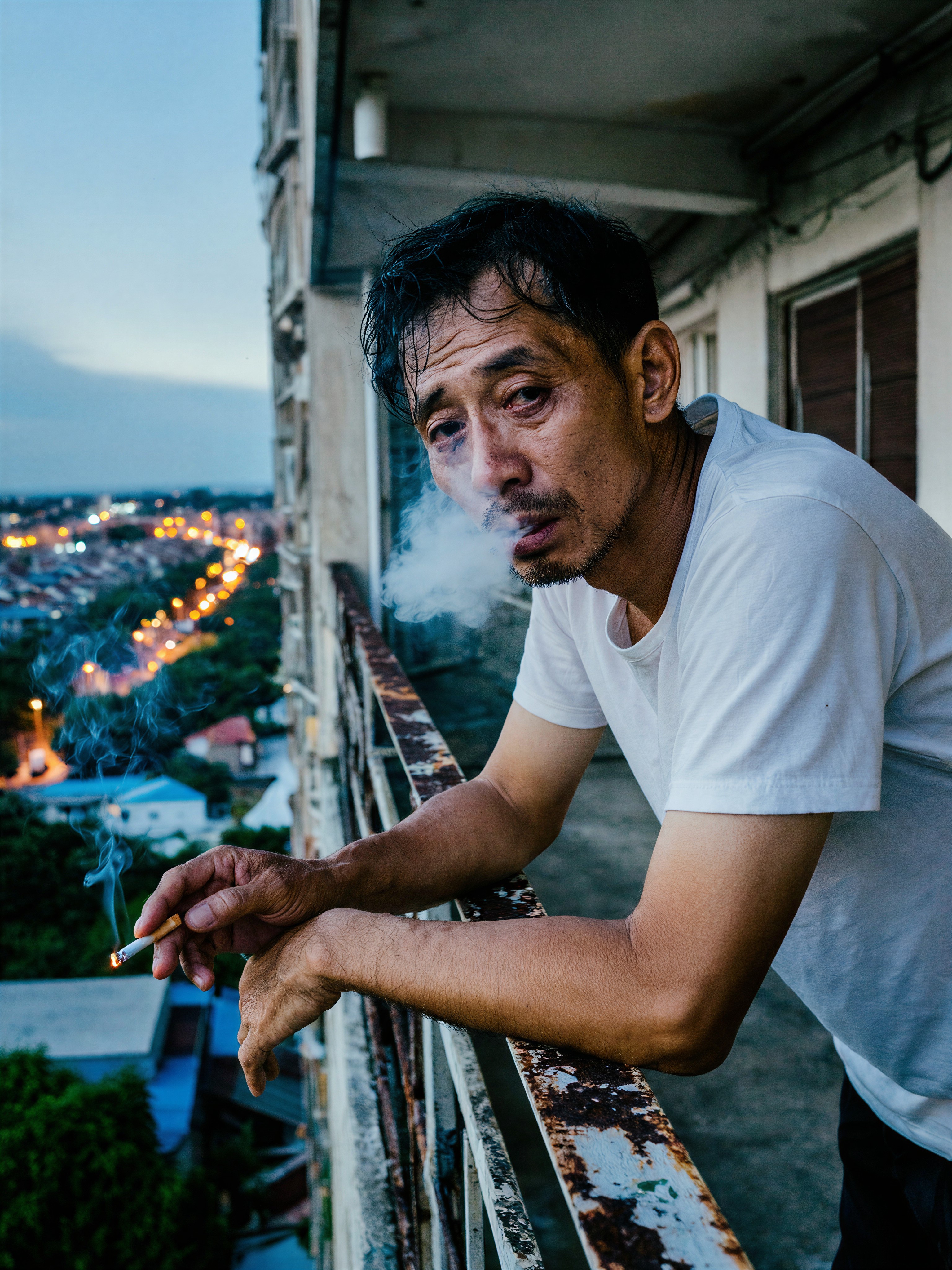 Documentary Style, a raw and cinematic shot of a man in his late 30s with slight stubble and tired but expressive eyes. He is leaning on a chipped metal railing of a high-rise apartment balcony at dusk. He is wearing a simple white t-shirt and holding a lit cigarette, the smoke swirling in the humid evening air. In the background, the glowing orange and blue lights of a suburban residential district. Low-key natural lighting, gritty textures of rusted metal and concrete, realistic skin pores and wrinkles, cinematic wide-angle, moody and honest storytelling, 8k.