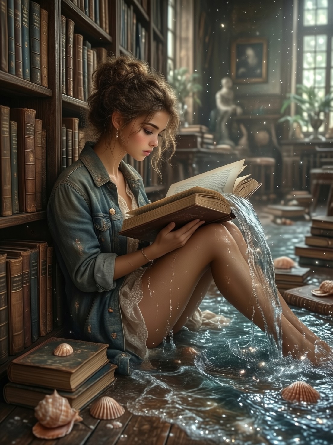 Magical Realism, a wide-angle shot of a grand, dusty classical library. A young woman is sitting on the floor, leaning against a bookshelf, deeply absorbed in a thick book. From the open pages of her book, a thin layer of real, sparkling ocean water is flowing out, covering the library floor with tiny waves and seashells. Soft light filtering through high windows, sharp focus on the water ripples against the old wooden floor, hyper-detailed book textures, dreamlike and calm, professional photography.
