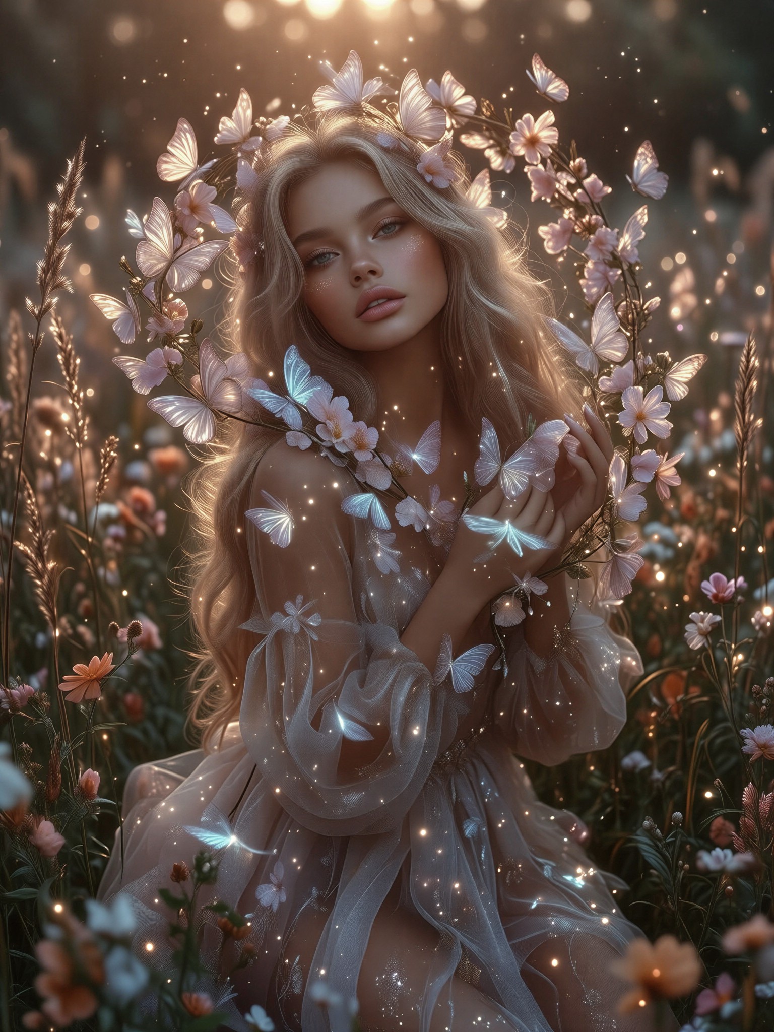 This level of dreamy detail is perfect for editorial spreads in fashion magazines, fantasy book covers, or high-end beauty campaigns. The 3:4 portrait orientation works especially well for Instagram stories and Pinterest pins, where the soft focus and glowing elements will stand out.