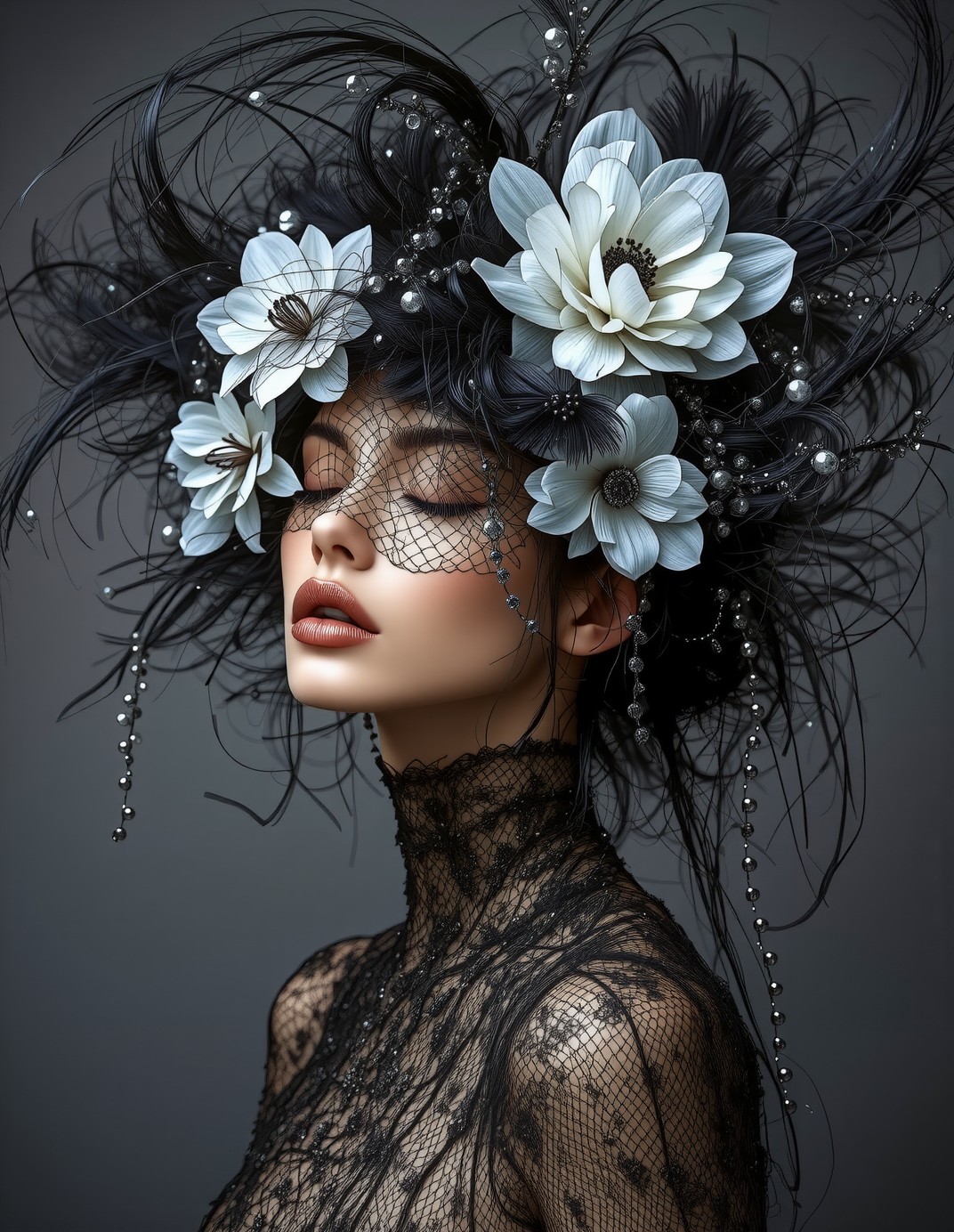The headdress isn't just ornamentation — it's a living, breathing extension of the figure's presence. Black and white flowers made of feathery petals cascade in layers, their delicate structure enhanced by tiny beads that catch light like dew on spider silk. Thin dark tendrils weave through the floral arrangement, creating a sense of motion that suggests the headdress is gently swaying despite the figure's static pose.