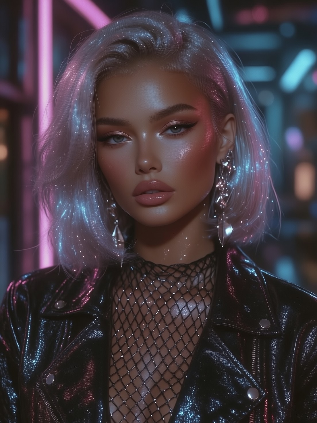 High-End Glamour Photography, Modern, a vibrant close up shot of a confident woman with a sleek, futuristic silver-blonde bob and bold, glossy eye makeup. She is wearing a minimalist black patent leather jacket over a black mesh bodysuit, and oversized, geometric silver earrings. The lighting is dominated by vivid pink and blue neon lights that create soft color reflections on her skin and the patent leather. High contrast, sharp details on the makeup and fabric textures, 8k render, masterpiece of Fashion Editorial aesthetics, powerful and mysterious