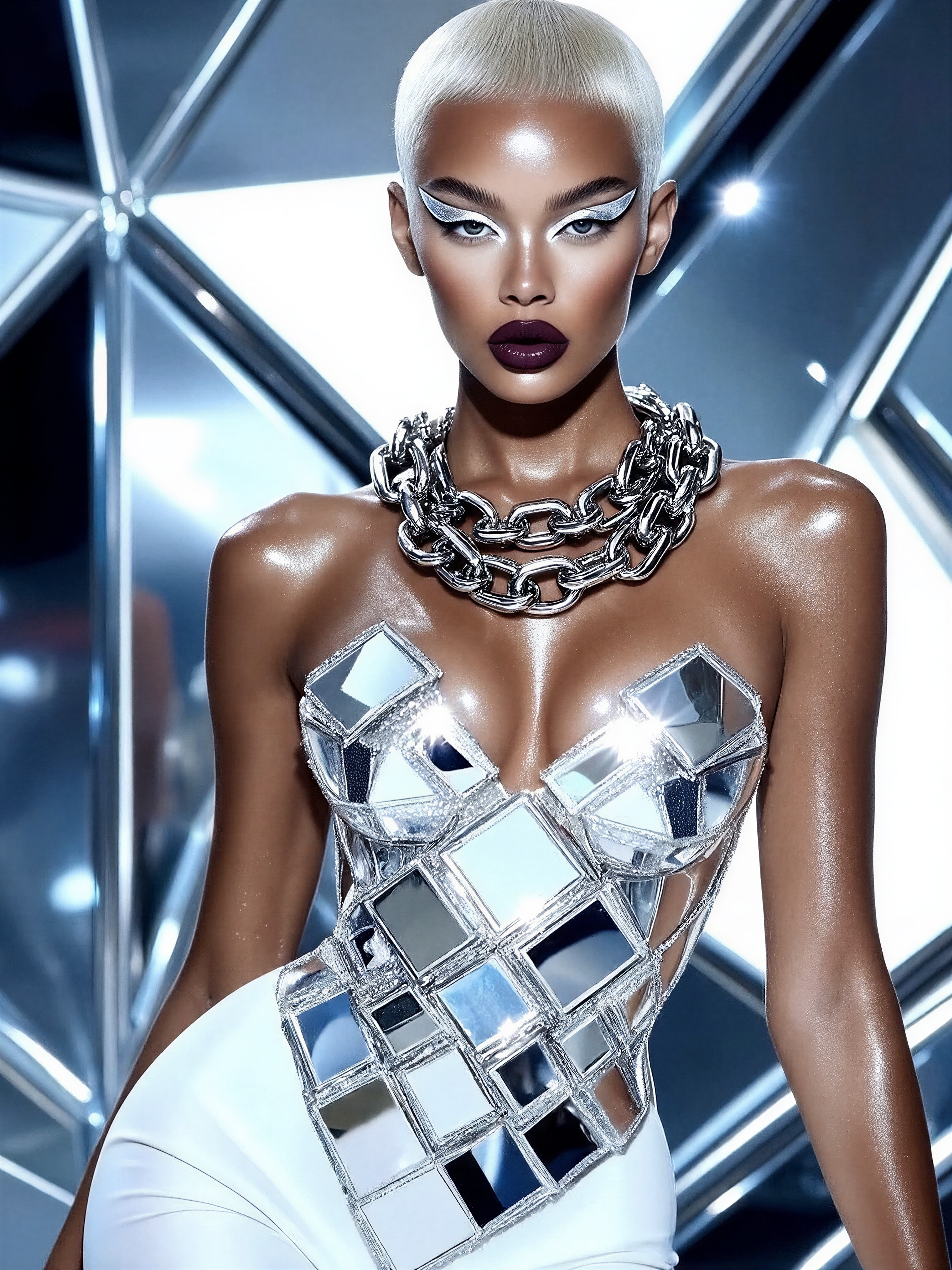The directional lighting creates razor-thin highlights on her platinum-blonde buzz cut, while the oversized silver chains around her neck catch the key light in geometric shards. This is not just a portrait — it's a statement of industrial chic, where high-fashion meets dystopian elegance, and every surface is a canvas for reflection.