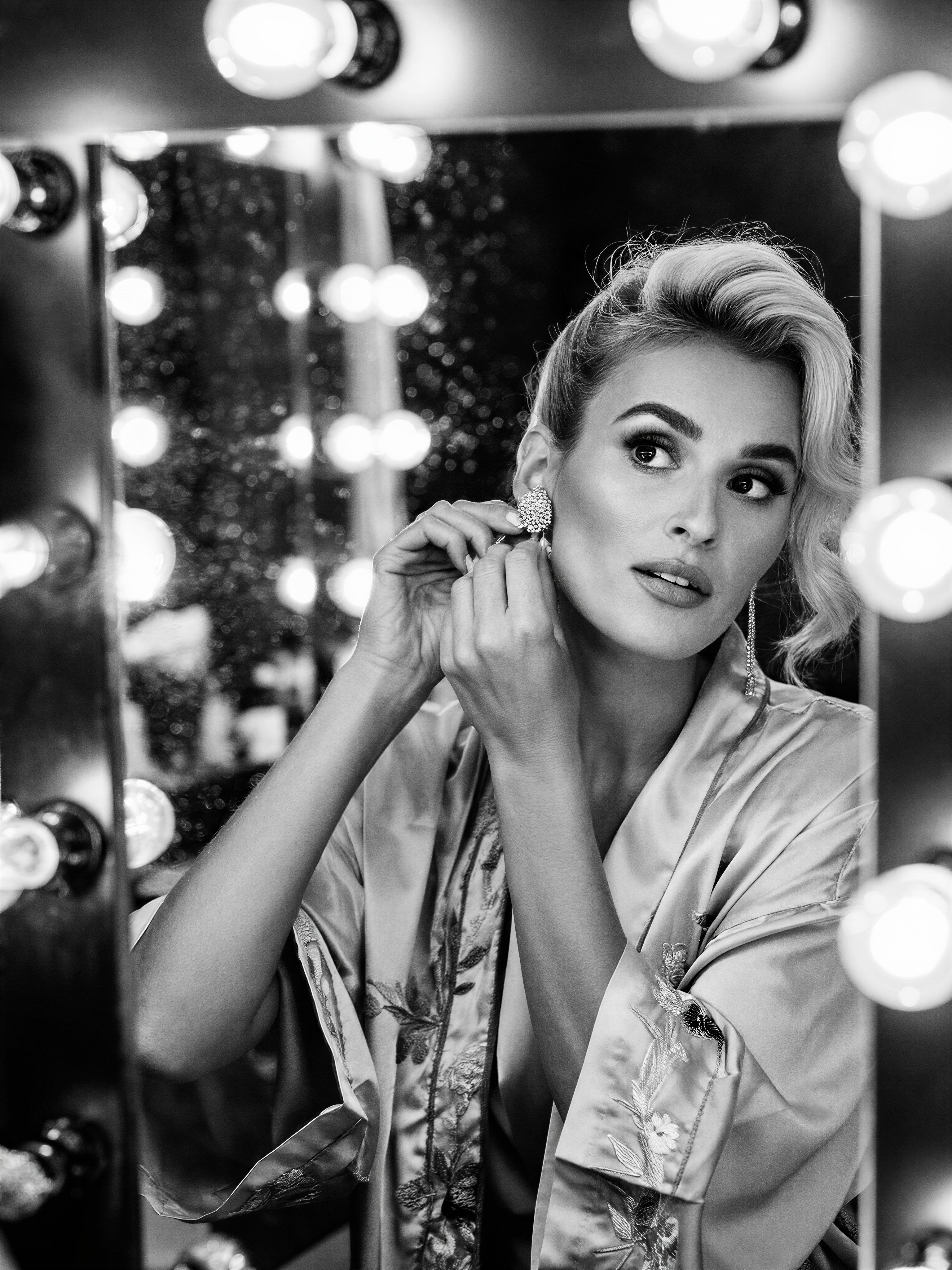 Glamour Photography, a candid-style black and white photo of a woman with defined, wavy blonde hair in a messy-chic style. She is sitting before a backstage vanity mirror, adjusting a shimmering silver earring. The glowing light bulbs around the mirror create a soft, radiant bokeh effect. She is dressed in a luxurious silk robe with intricate embroidery. Soft volumetric lighting, shallow depth of field, visible shimmering dust particles, cool monochrome palette, hyper-detailed fabric and mirror textures, professional studio quality.