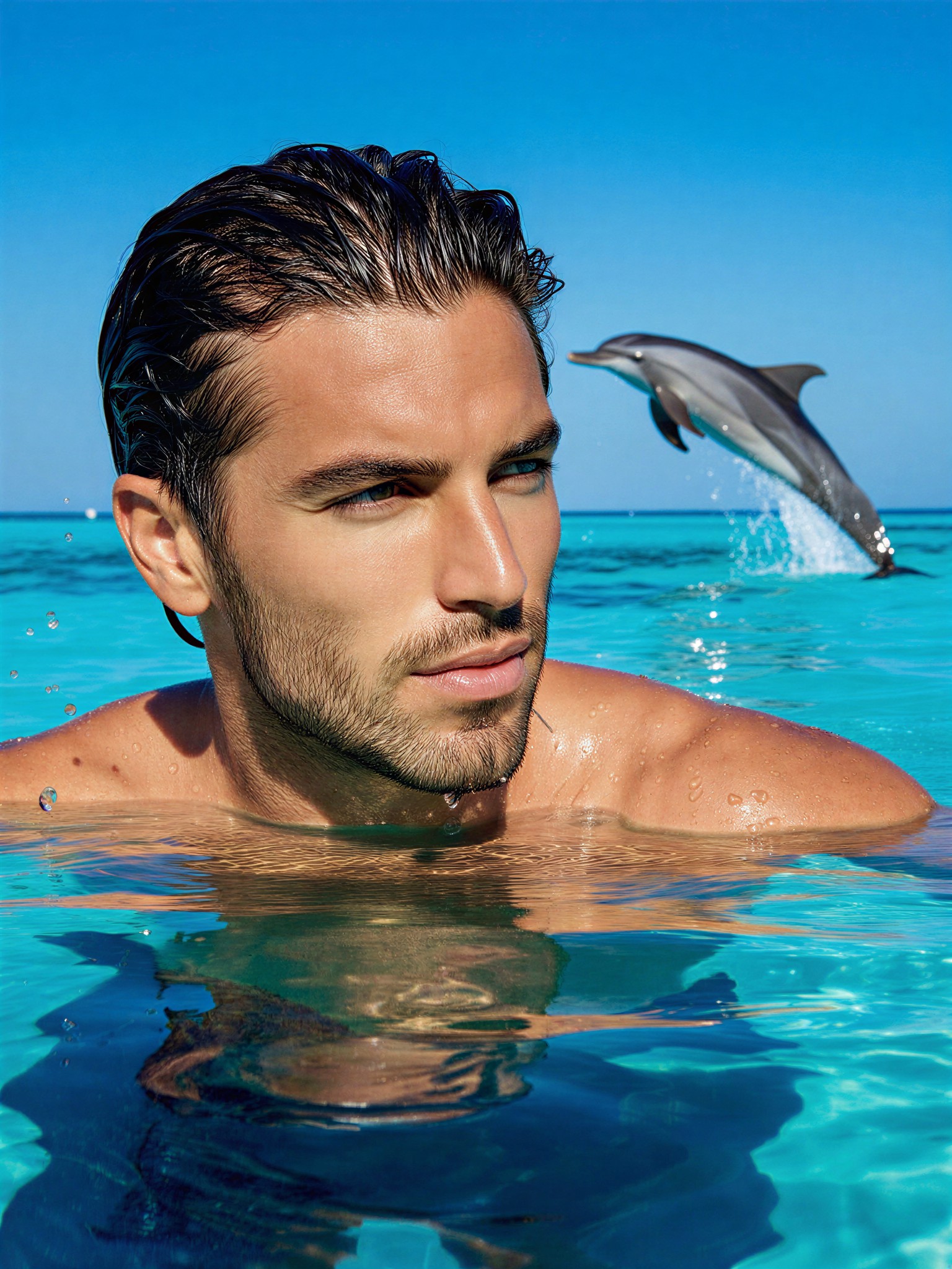 Glamour Photography, a stunning portrait of a beautiful man, approximately 30 years old, with a deep bronze tan, wet slicked-back dark hair, and defined light stubble. He is partially submerged in the turquoise water of a luxury infinity pool, looking towards a wild dolphin leaping gracefully in the background, near the open ocean. The entire scene is rendered in a rich, monochromatic blue color palette (teal, navy, aqua, and white). The golden hour sun creates shimmering reflections on his wet skin and the water. Hard directional lighting creating sharp fashion shadows, glistening skin texture, vibrant saturated colors, wide-angle lens, professional luxury vacation photography, hyper-detailed water droplets