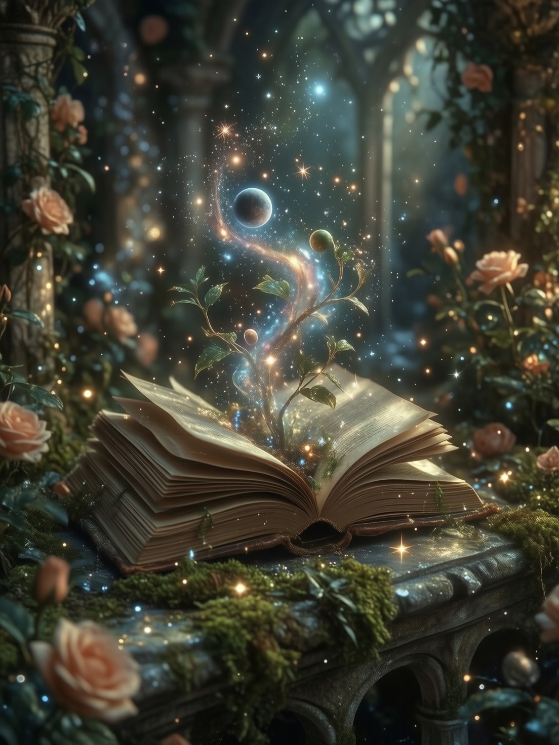 This prompt is tailor-made for fantasy novel covers, where the surrealism of a galaxy in a book can anchor a story's magical premise. It's also ideal for concept art in games or films that need a mystical, otherworldly atmosphere. The vertical 3:4 aspect ratio (1080×1440) preserves the garden's vertical depth while keeping the book and galaxy centered in the composition.