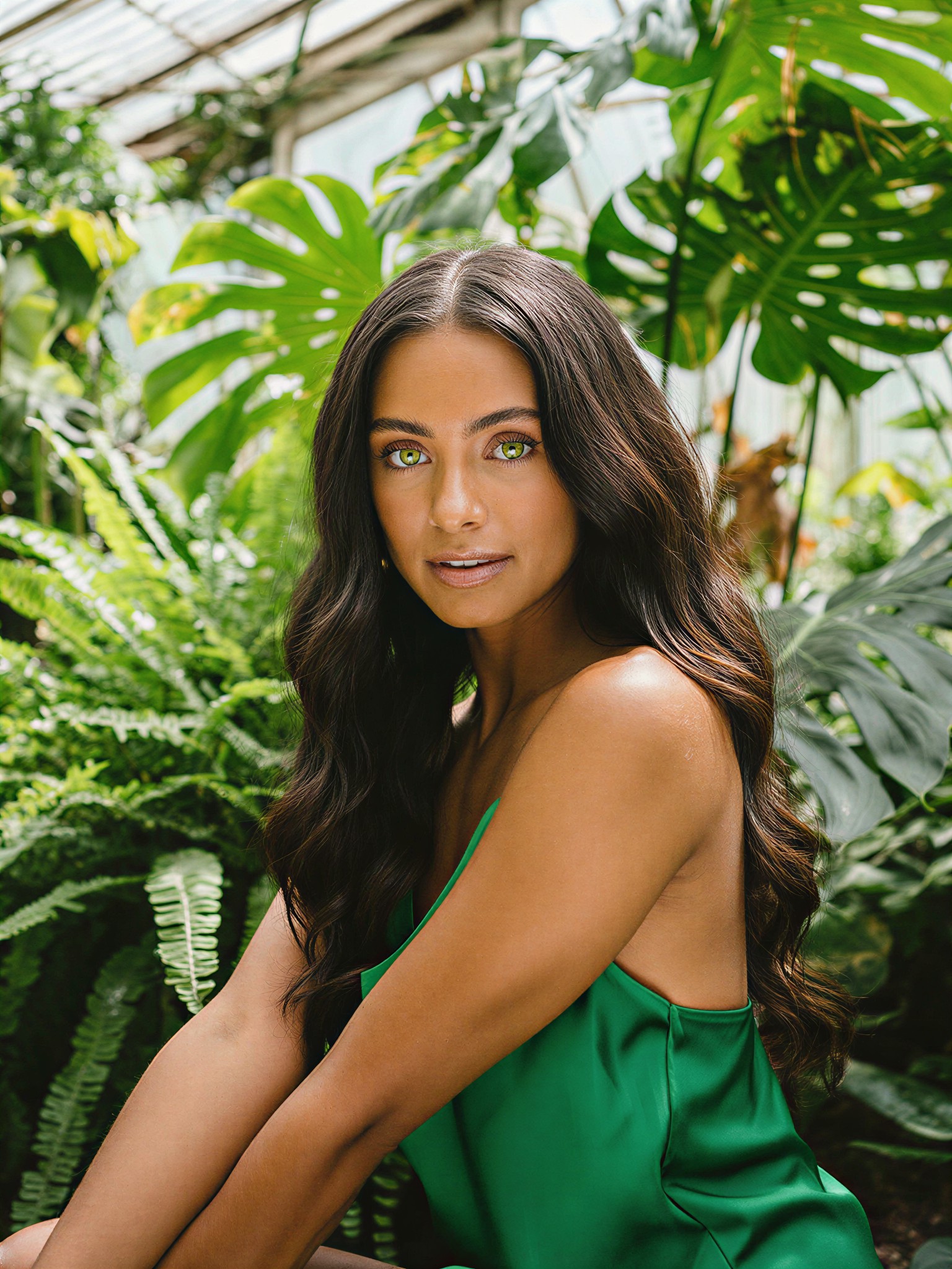 Professional Photography, a stunning portrait of a woman with a deep bronze tan and long, dark wavy hair. She is sitting in a lush greenhouse surrounded by giant tropical leaves of Monstera and ferns. She wears an emerald-green silk top. Dappled sunlight filtering through the glass ceiling, soft and diffused lighting highlighting her features, vibrant natural colors, shallow depth of field, sharp focus on her green eyes, hyper-detailed skin texture, raw photo quality, 8k.