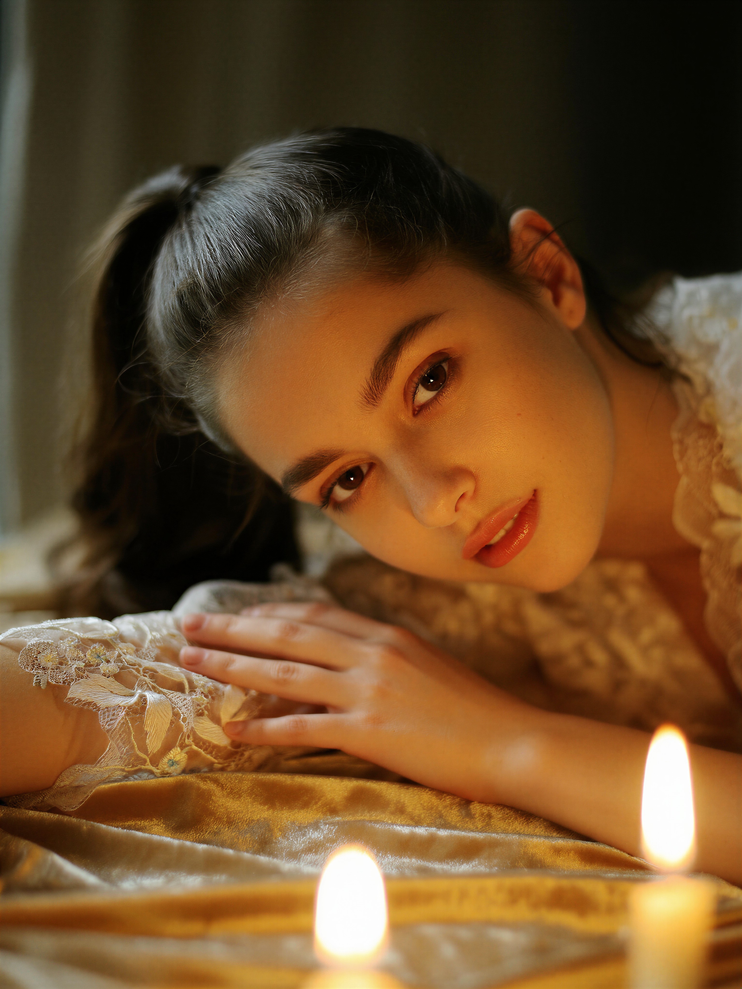Professional low-key portrait, a serene close-up of a gentle woman with a high ponytail and soft features. She is leaning forward, her arm resting on a beige velvet surface. The flickering light of nearby candles creates a dance of shadows, highlighting the fine embroidery of her white lace top and the realistic texture of her skin. Her gaze is introspective and soft. The atmosphere is intimate and quiet. Shallow depth of field with a dark, blurred background, warm amber tones, hyper-detailed textures of lace and hair, raw photo aesthetic.