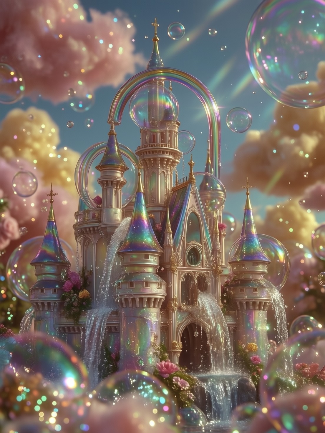 Dreamy Aesthetic, a fantastical castle constructed entirely from giant, iridescent soap bubbles and solidified rainbow arches, floating gently in a sky filled with soft, cotton-like pink and yellow clouds. Miniature waterfalls made of liquid opal cascade between the bubble towers. The sunlight makes the surfaces of the bubbles shimmer with a spectrum of colors. Shallow depth of field with a very soft bokeh background, ethereal glow, pastel color palette (pink, blue, yellow), visible water droplets and light reflections, high-resolution textures of bubble film, magical and whimsical atmosphere, 8k.