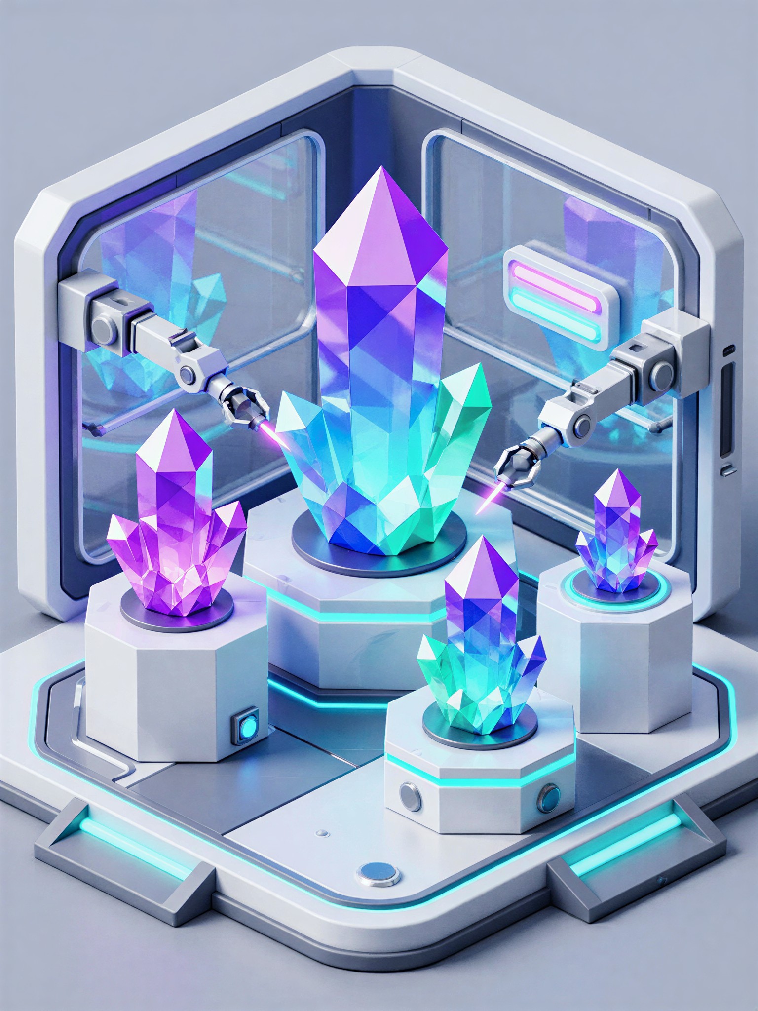 Isometric Art, a clean 3D cutaway view of a high-tech laboratory chamber. Inside, giant glowing purple and teal crystals are growing out of sleek white hexagonal pedestals. Robotic arms are laser-cutting the gems. Smooth matte surfaces, translucent glass panels, and harsh red emergency lighting. Low poly but high detail, soft ambient occlusion shadows, pastel and neon color palette, clean lines, trendy 3D render style, 4k, Unreal Engine 5 render aesthetic