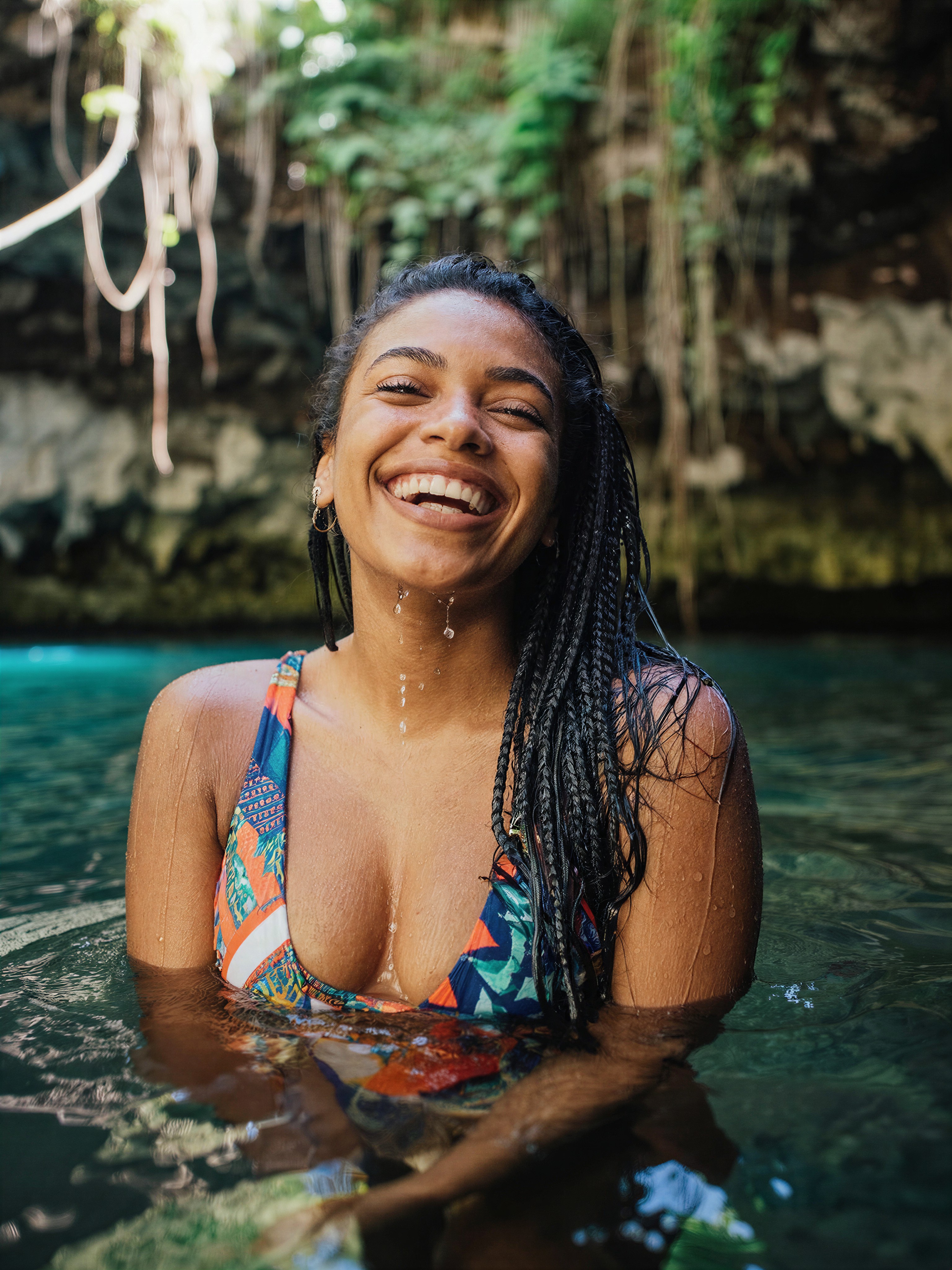 Water droplets cling to her skin like liquid diamonds, refracting the diffused jungle light that filters through the cenote's opening. The combination of sharp focus on her radiant expression and the soft, textured water around her creates a paradox — a hyper-realistic image that feels both tangible and magical. Z-Image Base captures the wetness of her braids, the luminous quality of her dark skin under natural light, and the way the vibrant swimsuit pattern interacts with the water's surface.