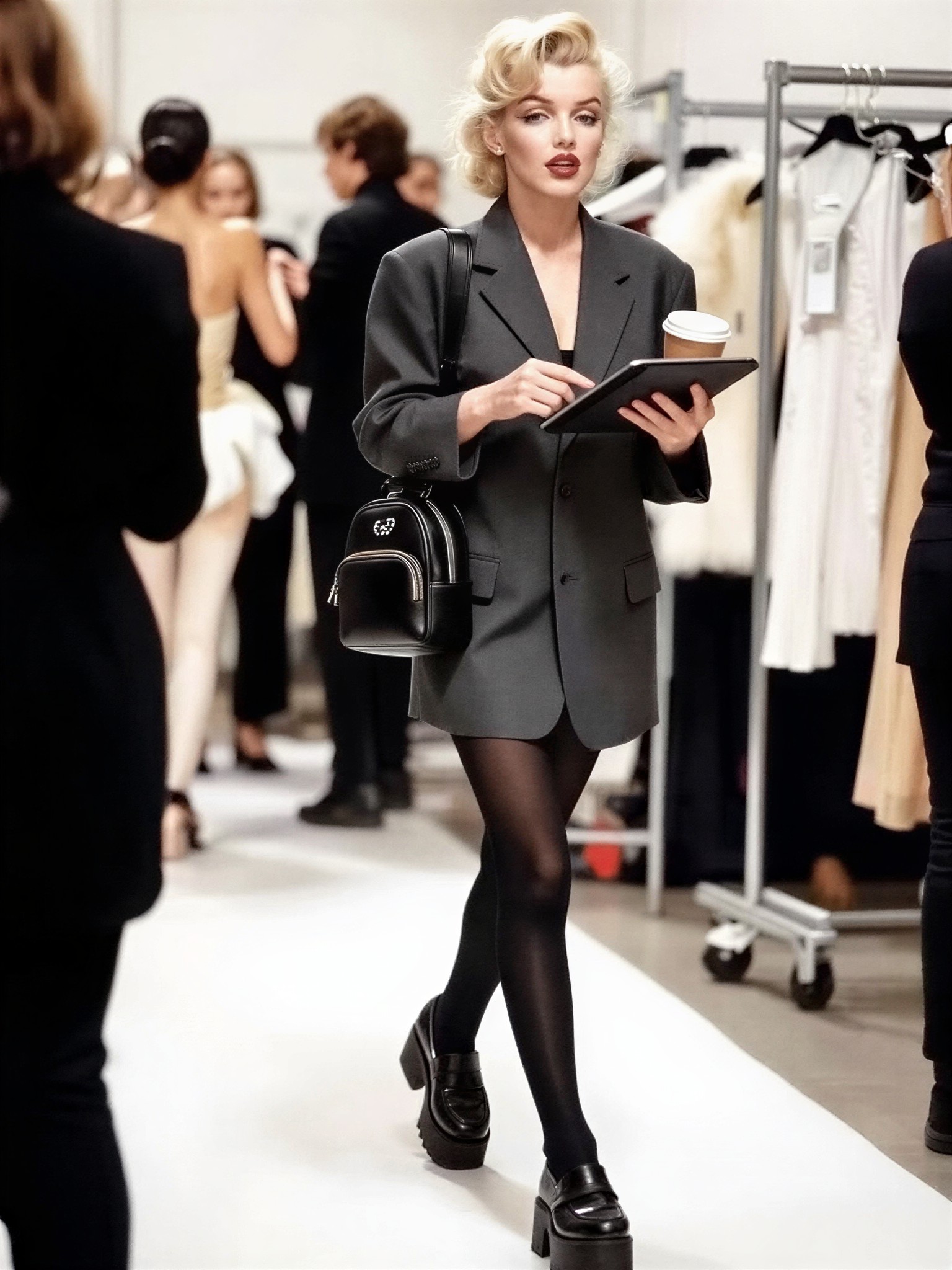 Documentary Style. Marilyn Monroe backstage at Tokyo Fashion Week. Wearing an oversized charcoal grey menswear-inspired blazer as a dress, black opaque tights, chunky black platform loafers, and a black leather mini backpack. Hair in a messy but chic low bun with loose face-framing strands. Holding a tablet and a coffee cup, walking quickly past racks of haute couture garments. Golden hour soft light filtering through sheer curtains, makeup artists and models in soft focus behind her. Focused determined expression, behind-the-scenes glamour. Realistic skin texture, fine details, shallow depth of field, 50mm f/2.0, 8k.