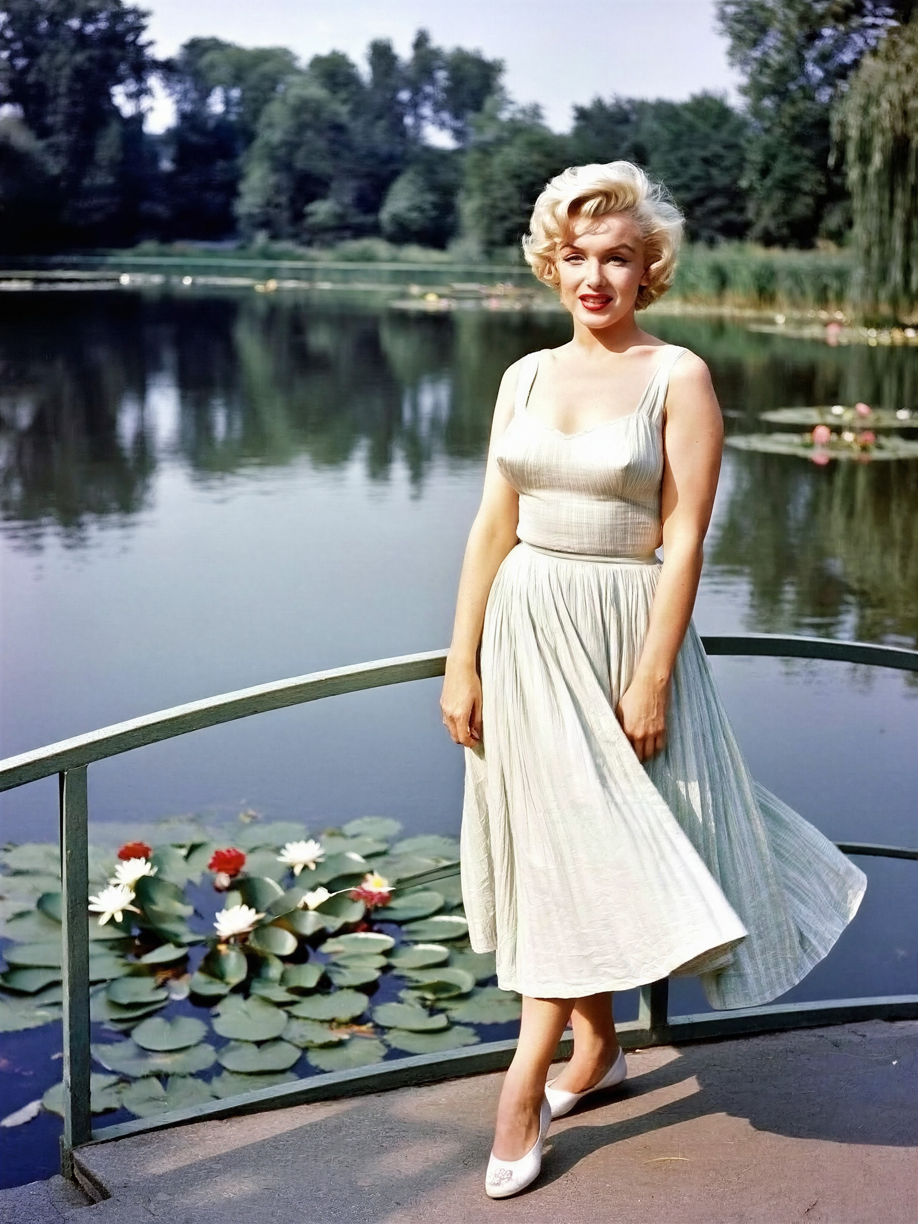 Marilyn Monroe standing by a small curved Chinese-style bridge over a lake, wearing a light summer dress. Soft breeze, dress gently moving. The lake has water lilies and colorful flowers blooming on the water surface. Natural daylight, soft reflections on the water. Muted pastel colors, calm serene atmosphere. Full body shot, realistic skin texture, fine details, slightly blurred background with lush greenery, peaceful outdoor setting.