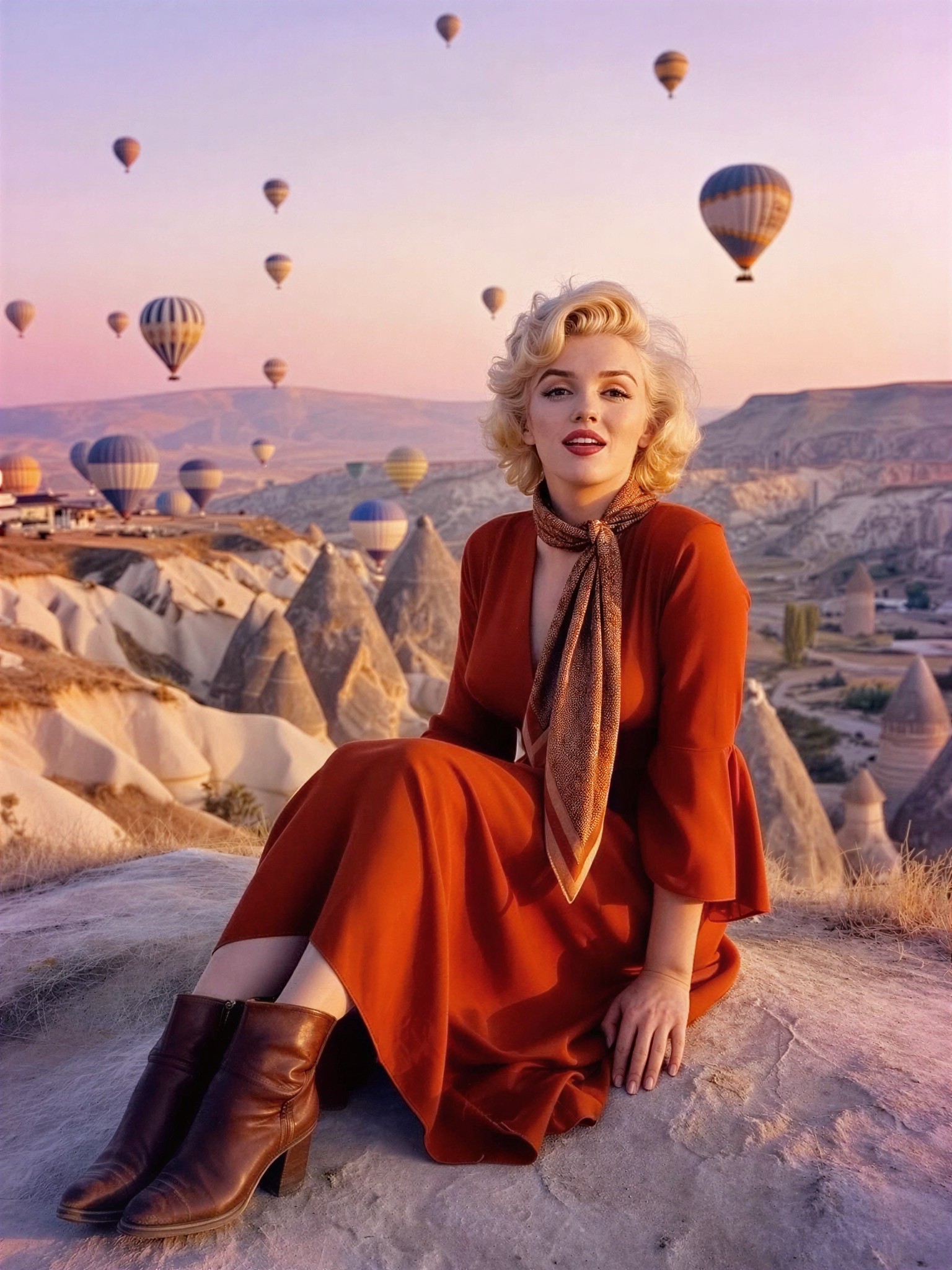 Marilyn Monroe sits on a rocky viewpoint in Cappadocia, Turkey at sunrise. Dozens of hot air balloons floating in the soft pink and orange sky behind her. Wearing a flowing rust-colored maxi dress with bell sleeves, leather ankle boots, a patterned scarf tied around her neck. Cool morning air, warm golden light hitting her face. Realistic skin texture, platinum curls, red lips, vintage Hollywood glamour, fine details, awestruck wonder expression, dramatic epic atmosphere.