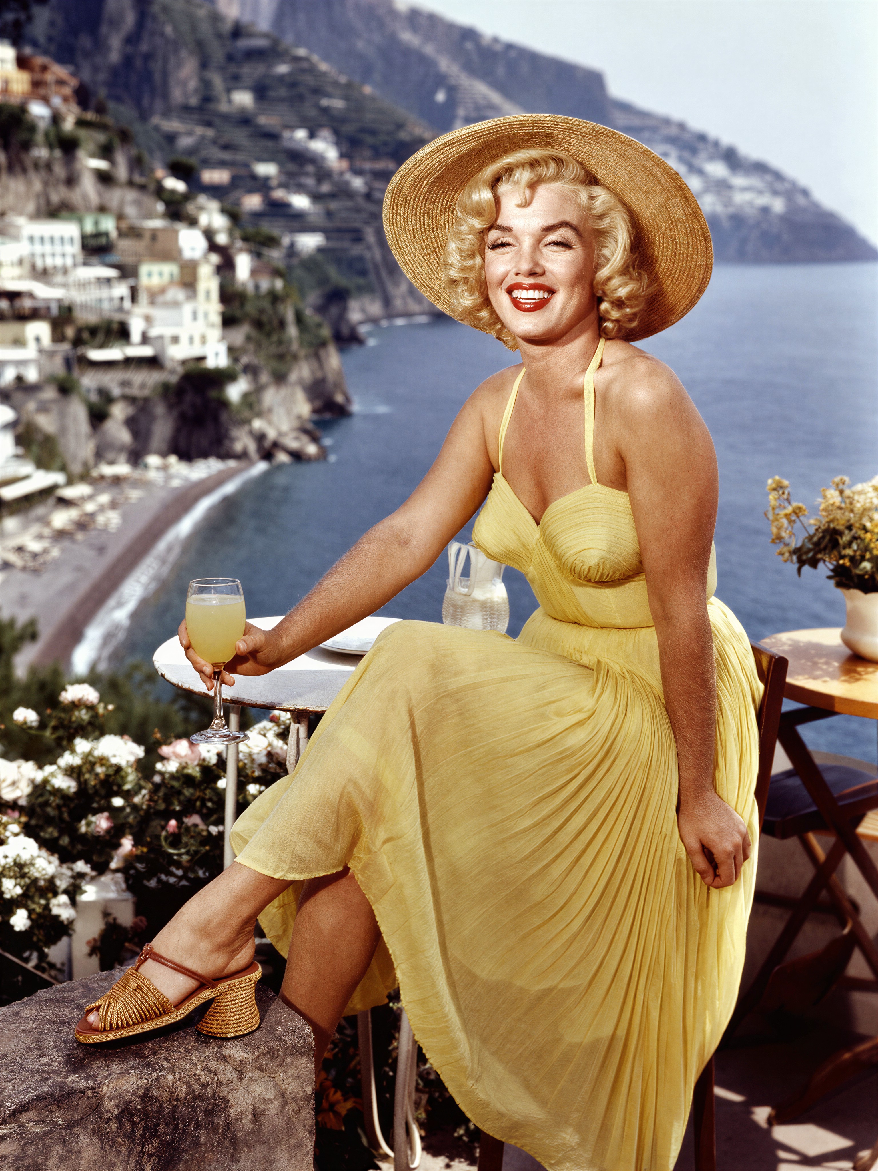 Marilyn Monroe relaxing on the Amalfi Coast, Italy. Sitting at a cliffside cafe table overlooking colorful seaside villages and the blue Mediterranean Sea. Wearing a flowing lemon-yellow sundress, oversized straw hat, woven sandals. Holding a glass of limoncello. Dramatic sunset lighting, deep orange and pink sky, soft sea breeze. Realistic skin texture, fine details, relaxed contemplative expression, cinematic atmosphere.