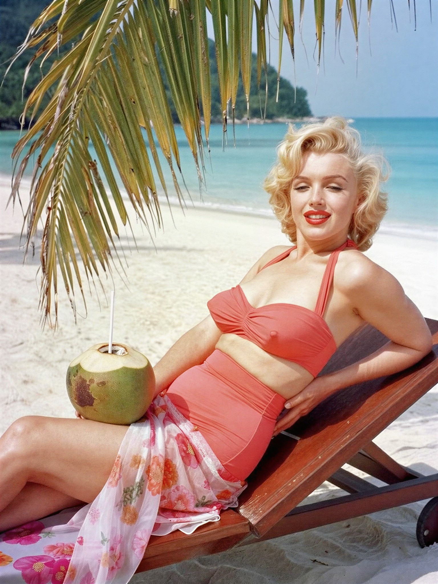 Marilyn Monroe relaxing on a white sand beach in Malibu, California. Lying on a wooden lounger under a large palm tree, turquoise water in the background. Wearing a vintage 1940s high-waisted two-piece swimsuit in coral pink, a sheer floral sarong wrapped around her hips. Holding a fresh coconut with a straw. Warm tropical afternoon light, gentle sea breeze. Realistic skin texture, fine details, blissful relaxed expression, paradise atmosphere.