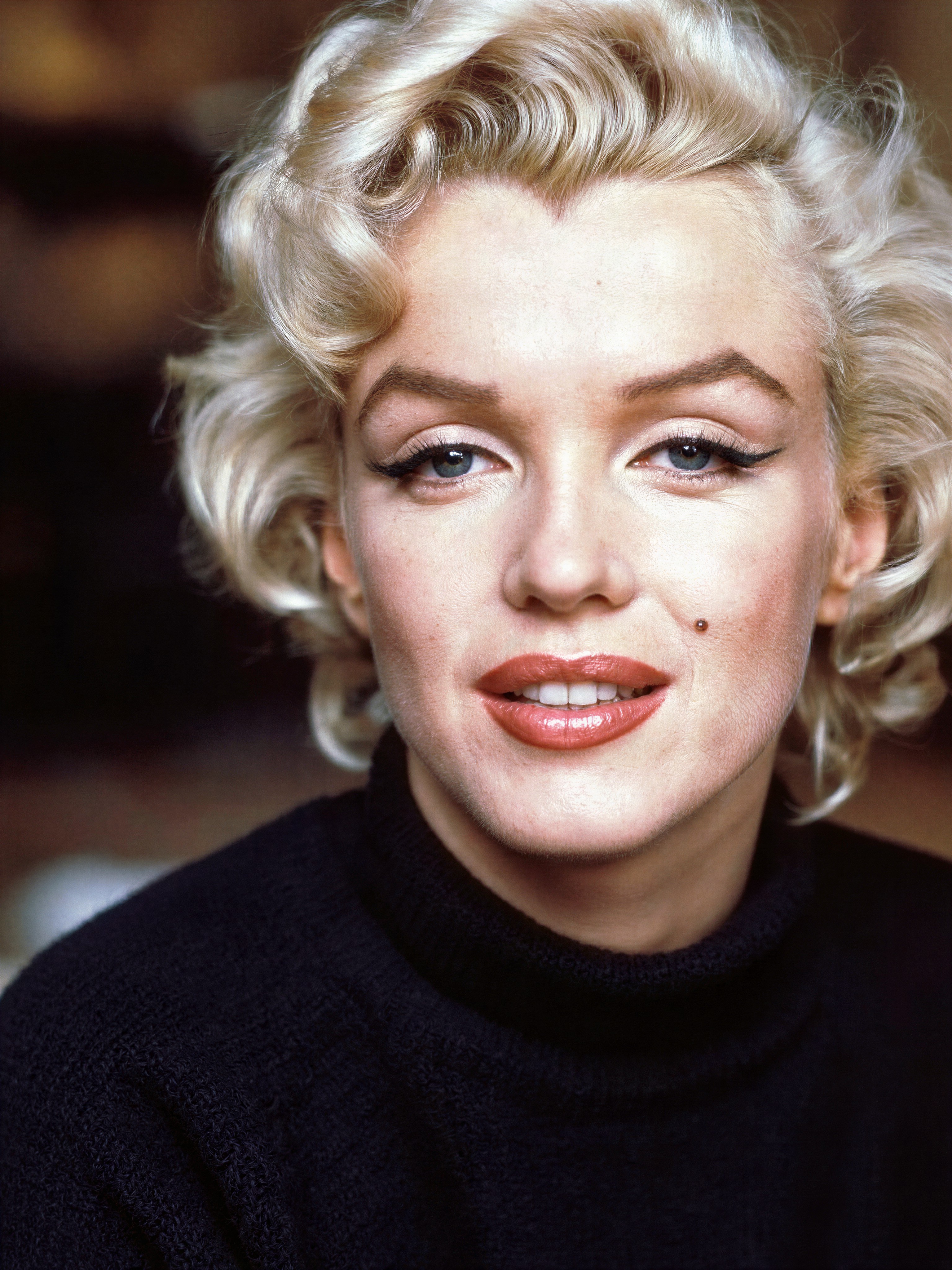 Marilyn Monroe. Professional Photography, a captivating extreme close-up portrait of a modern Marilyn Monroe. She has short, styled, platinum-blonde curly hair with a soft, messy side-part and natural, glowing skin texture with subtle freckles. Her signature mole is visible. She has defined, arched eyebrows and dark, winged eyeliner with voluminous lashes, but is wearing a delicate, nude-pink glossy lipstick instead of classic red. She looks directly into the lens with a soft, introspective gaze and a faint, genuine smile. She wears a structured, high-neck black cashmere sweater. Soft, diffused daylight filters from the side (Chiaroscuro), creating gentle shadows that define her facial features and highlight the rich fabric texture. Extremely shallow depth of field, rendering the background into a smooth, dark bokeh with warm light reflections. Authentic film grain, high-end magazine quality, 8k resolution.