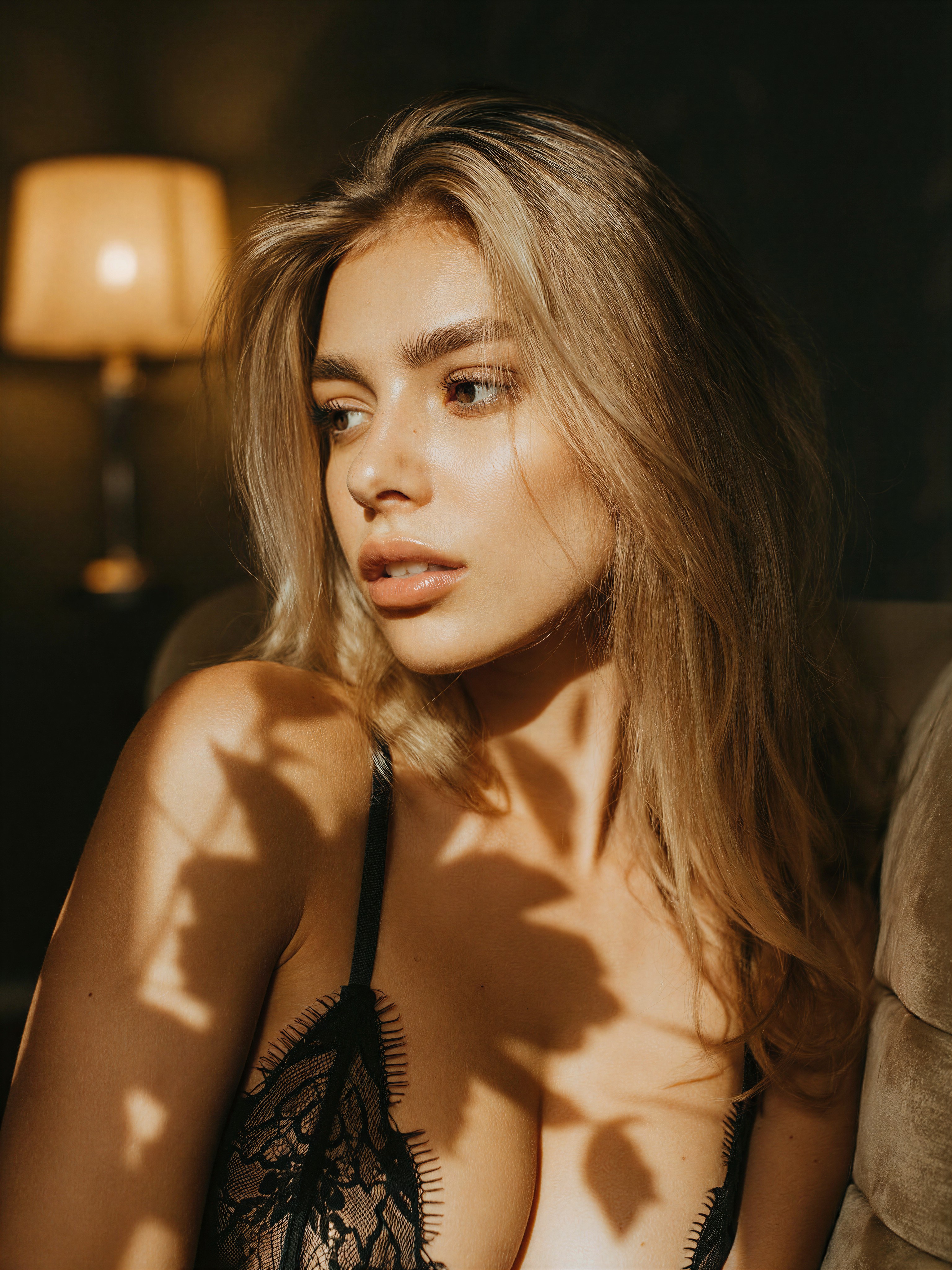 Cinematic photography, a moody and tender low-angle full-body shot of a strikingly beautiful woman with voluminous blonde hair. She is seated in a dimly lit room, illuminated by a single warm bedside lamp, wearing black lace lingerie. The light casts intricate floral shadows across her soft skin and the beige velvet chair. The focus is on her hyper-realistic face, showing natural skin texture and a soft, thoughtful expression as she looks into the darkness. Deep shadows, warm highlights, high contrast, 16:9 cinematic composition