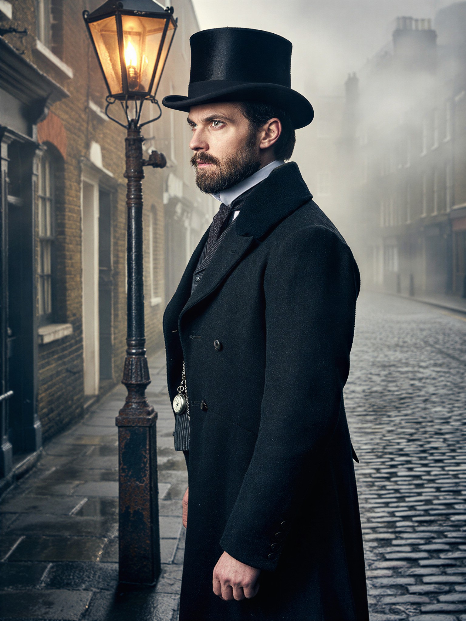 Cinematic Style, a moody Noir Style composition. A mysterious man in his 30s with a sharp profile and a well-groomed beard stands under a flickering gas lamp on a wet cobblestone street in Victorian London. He wears a heavy, tailored black wool overcoat and a silk top hat. A silver pocket watch chain glints against his waistcoat. He stares into the thick, volumetric fog. Low-key natural lighting, dramatic shadows from the gas lamp, gritty textures of rusted iron and damp pavement, highly detailed fabric weave, cinematic depth of field, sharp focus on his expressive eyes, 8k.