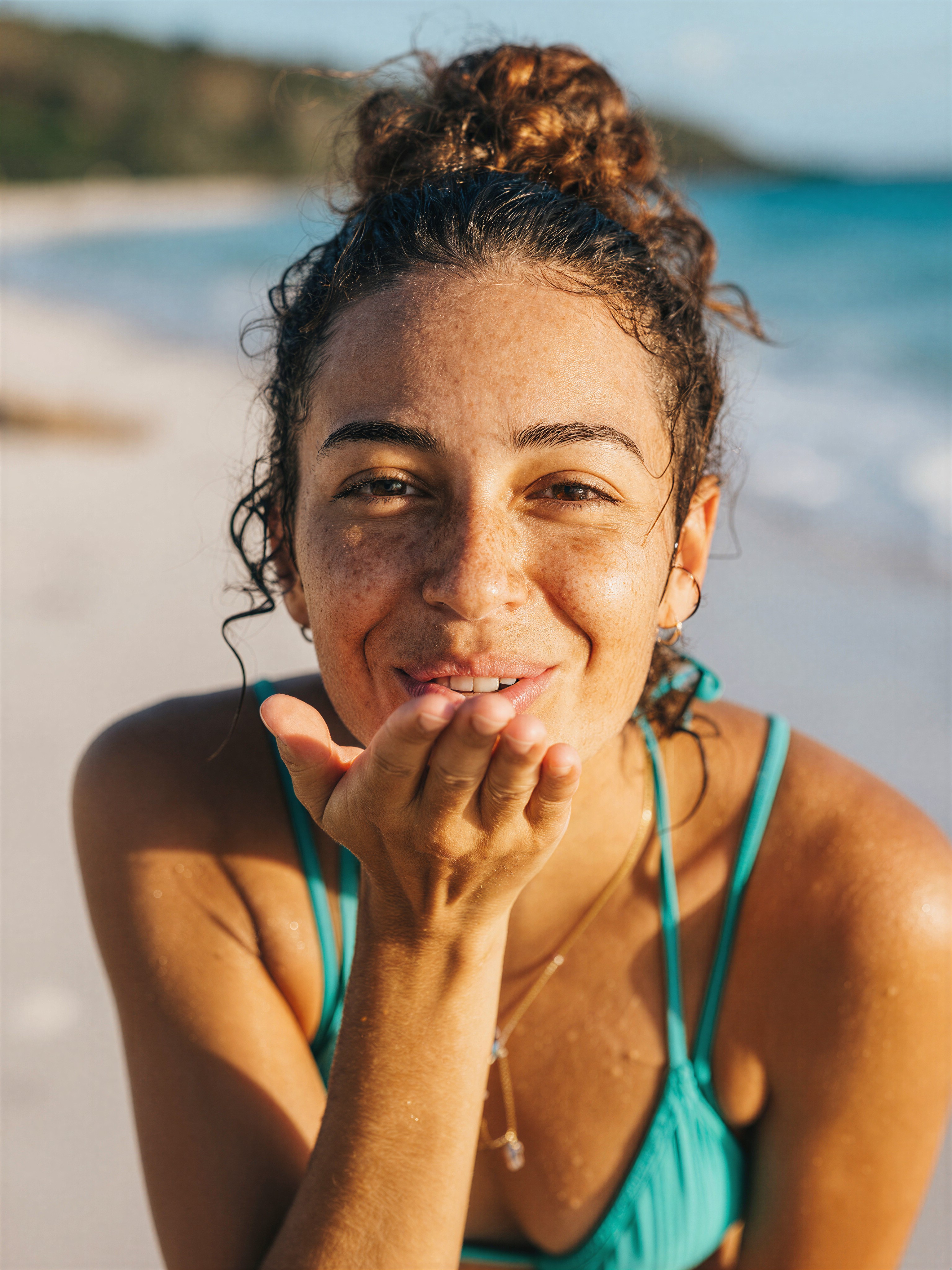 There's a moment when sunlight hits water droplets on hair and turns them into tiny prisms — that's what Z-Image Base captures here. The young woman's messy bun, still damp from the ocean, catches the golden hour light in a way that feels almost magical. Her genuine smile and air kiss create a sense of unguarded joy, while the blurred tropical beach background becomes a soft gradient of blue and white. The 85mm lens effect sharpens her face against the bokeh, making every freckle and water droplet pop with cinematic clarity.