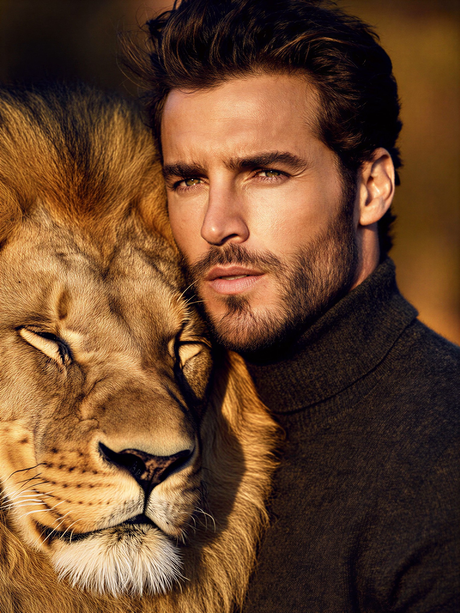 Fine Art Photography, an imposing, close-up portrait of a powerful and strikingly handsome man, approximately 30 years old, with sharp features, dark messy hair, and a defined light stubble. He wears a dark, textured charcoal turtleneck. Beside his face, a massive male lion with a full dark mane is resting its head, closed eyes in majestic peace. The entire scene is rendered in a rich, monochromatic gold and warm red color palette. Soft, volumetric warm lighting (chiaroscuro) illuminates the rich velvet texture, the lion’s coarse mane, and the man’s smooth but defined skin. Completely blurred, dark and warm background (golden hour bokeh). Majestic and artistic composition, 8k resolution.