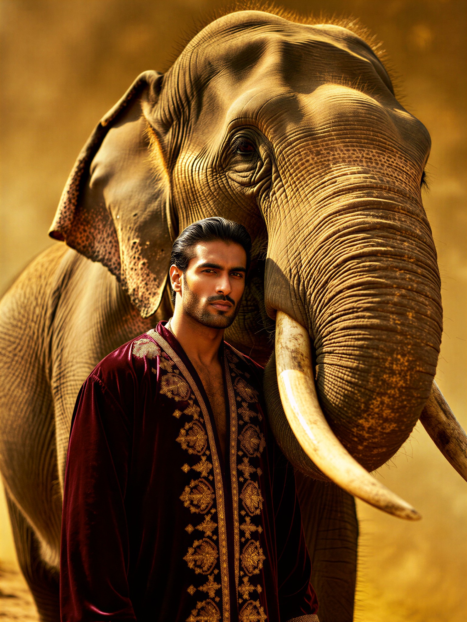 Fine Art Photography, an imposing and cinematic close-up portrait showcasing the incredible scale between a powerful, handsome man (30 years old) and a massive, ancient bull elephant. The man has sharp features, dark hair, and a stylish light stubble, dressed in a heavy, rich burgundy velvet robe with intricate gold thread embroidery. He stands fearlessly beside the elephant's enormous head, with the elephant’s giant, weathered trunk resting protectively over his shoulder. A magnificent ivory tusk is visible in the frame, emphasizing the animal's grand size. The entire scene is rendered in a monochromatic palette of deep gold, ochre, and warm burgundy. Soft, volumetric lighting (chiaroscuro) highlights the dramatic contrast between the man’s smooth skin and the elephant’s thick, wrinkled, leathery skin. The background is a completely dark, warm, and blurry golden hour bokeh. Majestic, royal, and artistic composition, 8k resolution, hyper-realistic textures.