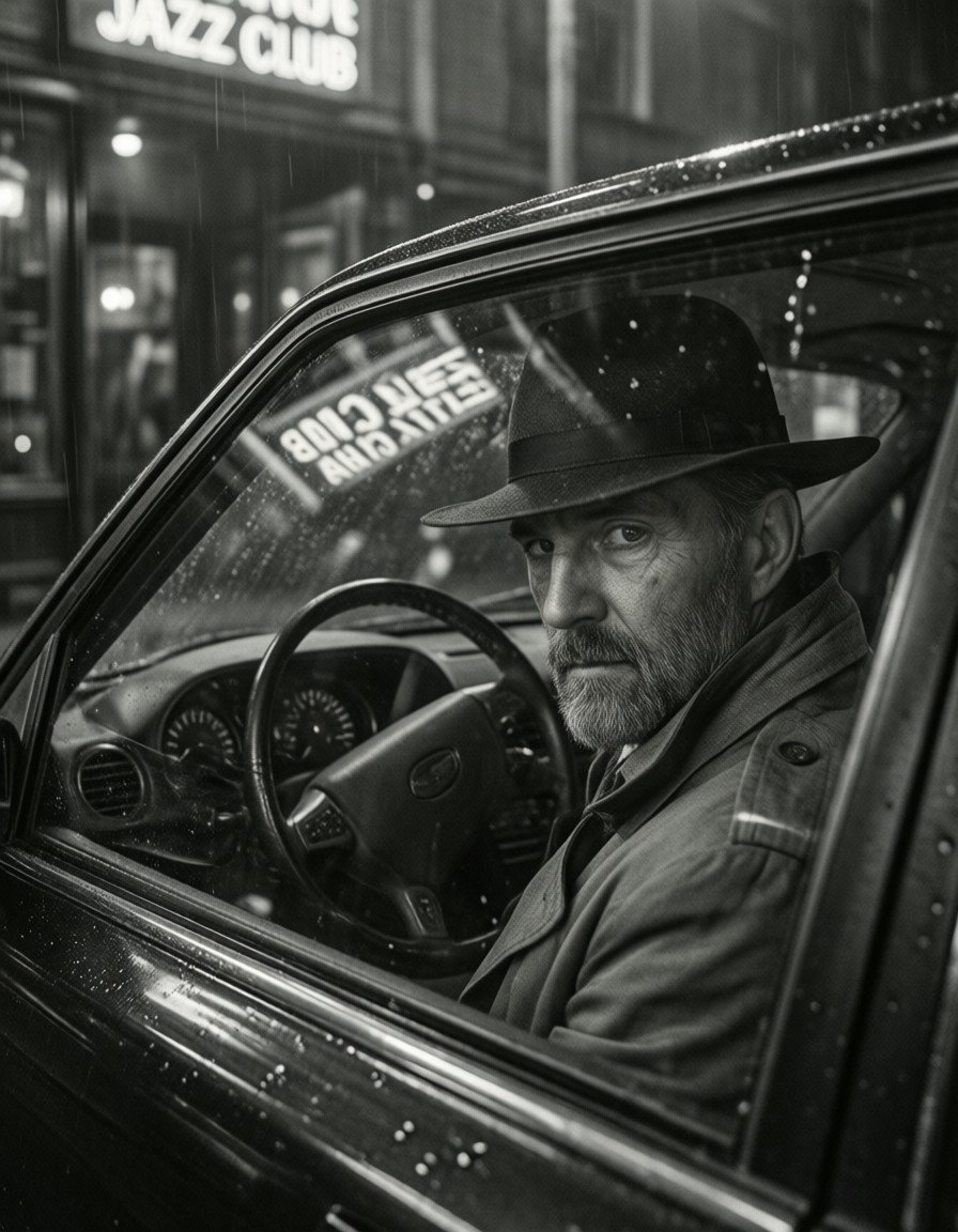 Noir Style. A grizzled private investigator sits in a parked car outside a smoky jazz club, watching the entrance. Dashboard glowing faintly, rain on windshield distorting neon sign reading "JAZZ CLUB" in reflection. Trench coat collar up, fedora low. Black and white, film grain, moody atmosphere, suspenseful narrative