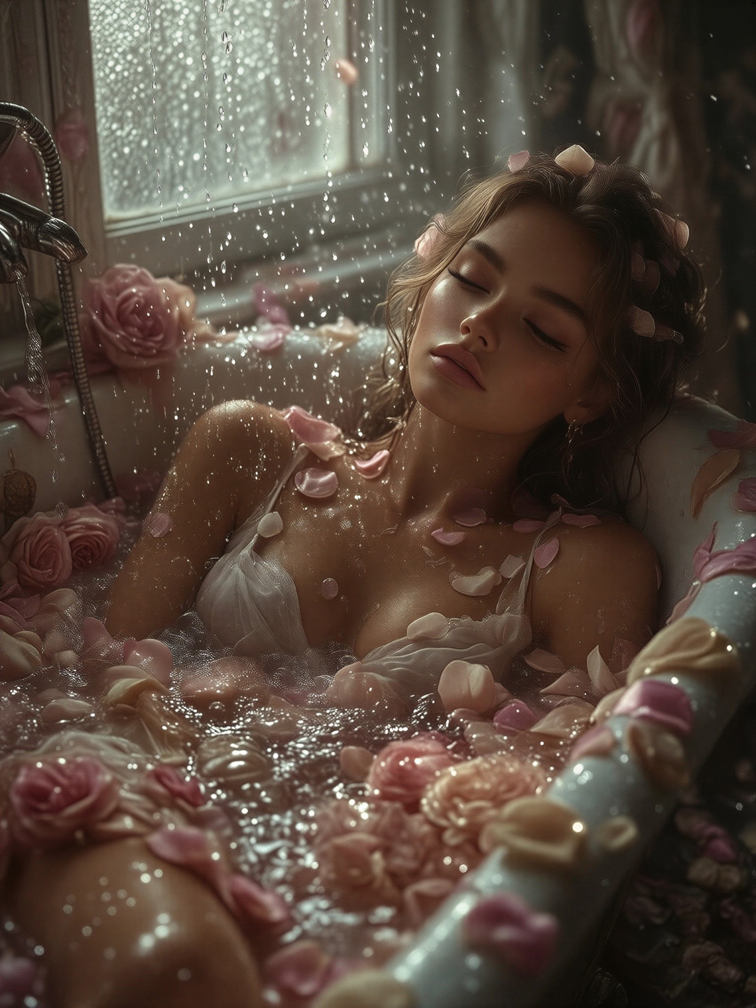 Dreamy Aesthetic. A close-up view of a delicate girl submerged in a vintage clawfoot bathtub filled with milky, pastel pink water. The water surface is almost entirely covered with soft pink and white rose petals and floating, shimmering bubbles. She wears a silk slip, her face is relaxed, eyes closed, leaning against the rim. Soft, diffused lighting filters through a frosted window, casting long, gentle shadows and creating a soft glow on her skin. Tiny crystalline dewdrops hang in the air. Palette of blush pink, soft cream, pale coral, and seafoam green. Intimate, serene, nostalgic, masterpiece.