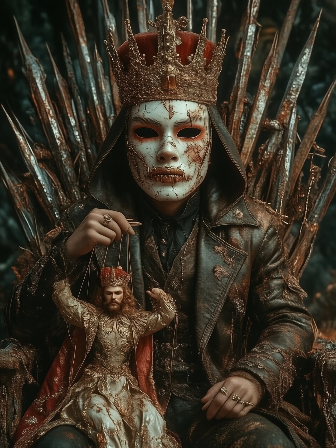 Dark Fantasy, a medium shot of a sinister figure whose face is a cracked porcelain mask stitched to a leather hood. He sits on a throne made of giant rusted needles, holding a marionette that looks exactly like a king. High contrast, gritty textures of rusted iron and cracked ceramic, dramatic shadows, blood-red and cold grey color palette, Unreal Engine render quality.