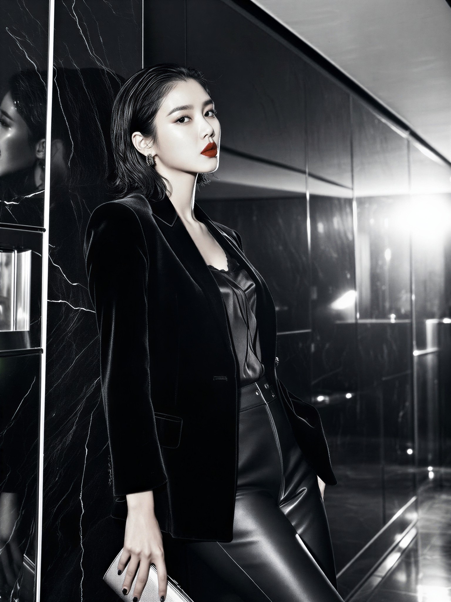 Glamour Photography, a sophisticated, monochromatic black portrait of a breathtaking young Korean woman (early 20s) with defined cheekbones, wet-look dark bob haircut, and bold matte red lipstick. She is leaning against a massive, cracked black glass mirror wall in a minimalist, black marble luxurious lobby. She wears a structured black tailored velvet blazer over a sheer silk top and black leather pants, holding a sleek silver clutch. Dramatic low-key lighting from a single source illuminates only the essential lines of her profile and the rich velvet and leather textures against the black mirror. Moody and intense atmosphere, shallow depth of field, sharp focus on her expressive eyes, professional color grading.
