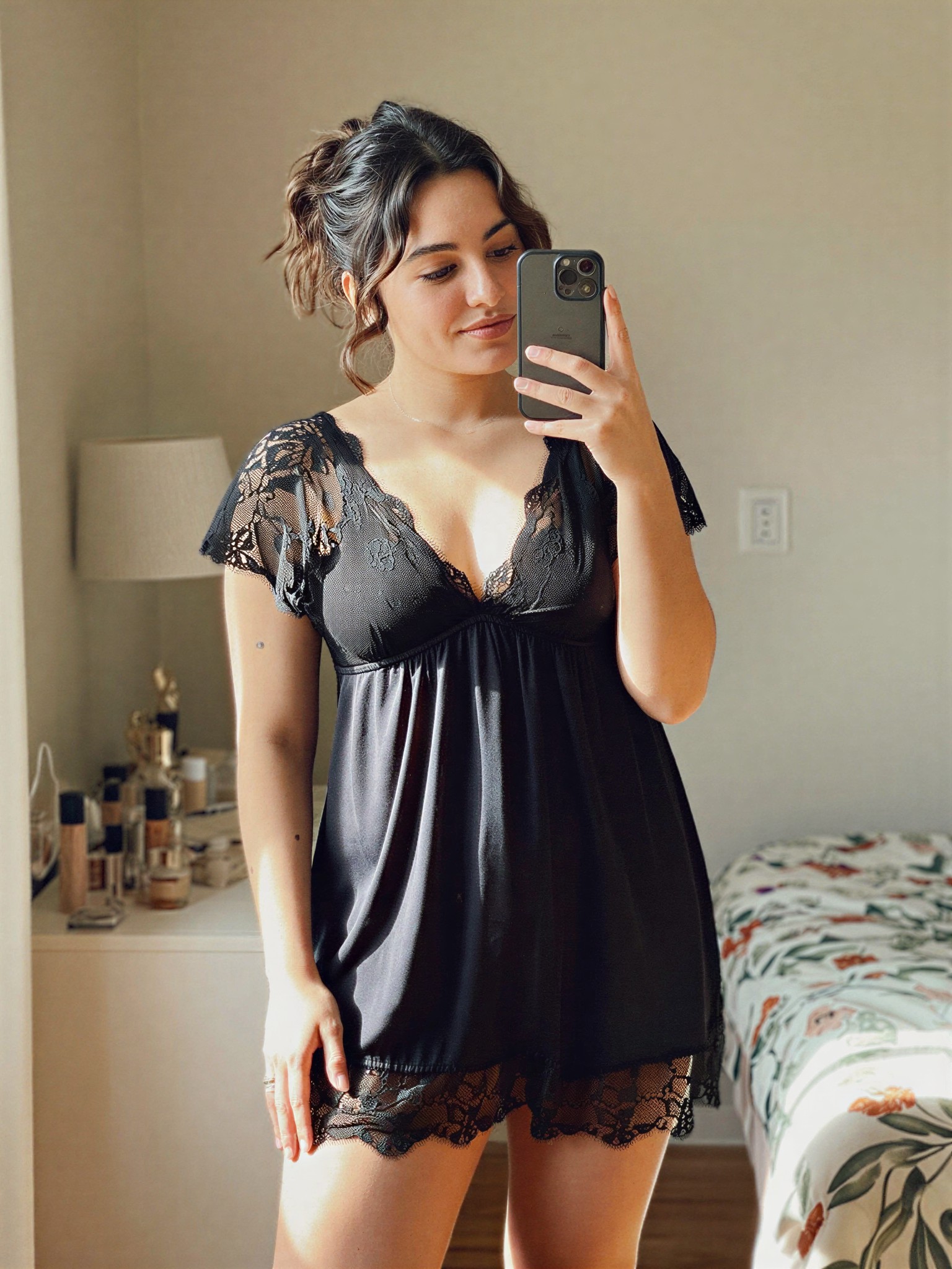 Realistic photo, mirror selfie. A casual, ordinary young woman with dark, wavy hair tied loosely. She leans against the wall, one hand on hip, confident expression, standing in a cozy bedroom with natural sunlight. Wears a stylish black nightshirt with floral lace, soft warm color grading, shallow depth of field, sharp focus on the phone and her expression, authentic film grain.