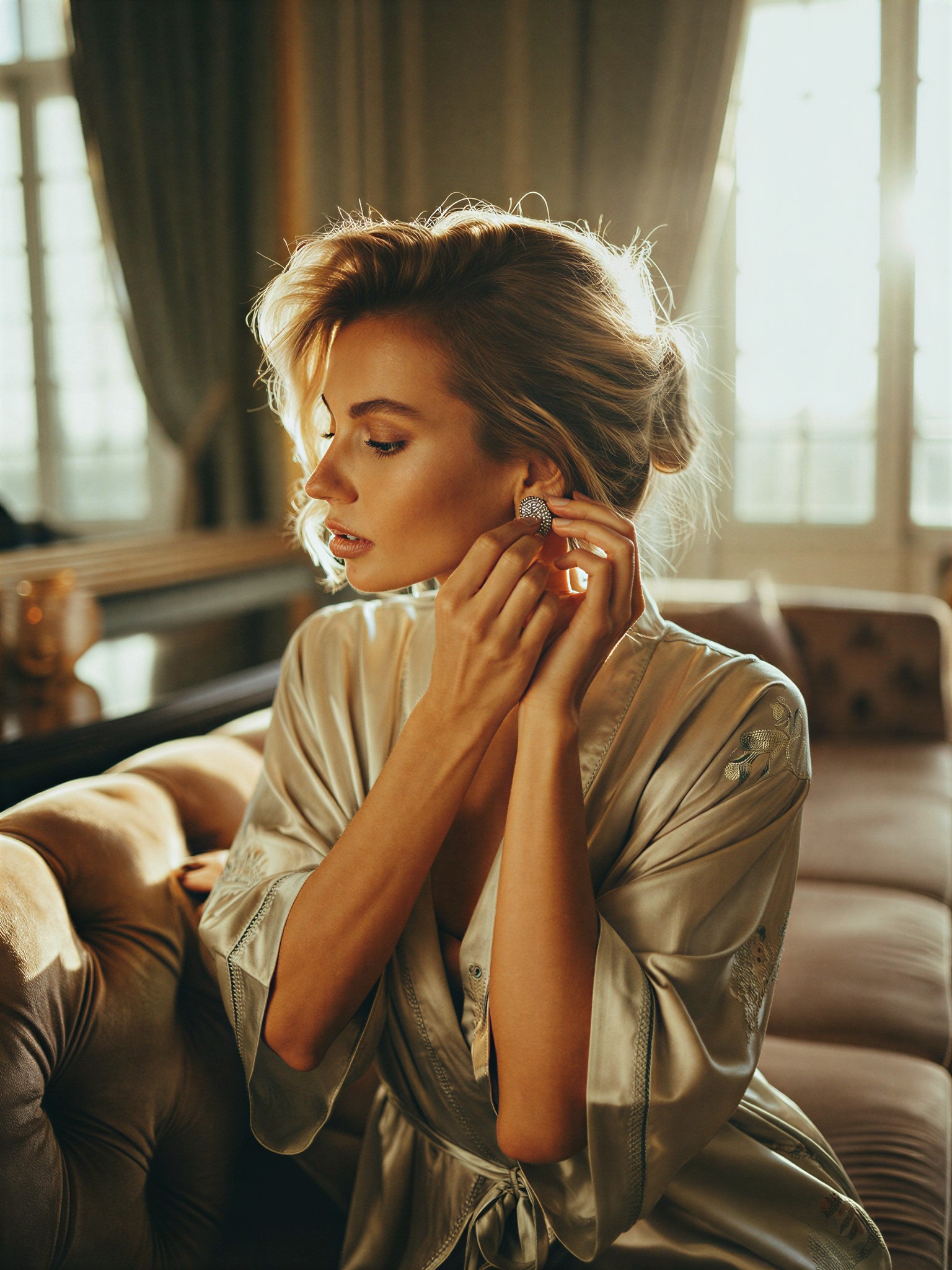 Professional Photography, a stunning woman with defined, wavy blonde hair in a messy cool style. She is sitting in a chaotic yet elegant pose on a plush velvet sofa inside the villa's sun-drenched living room. She is adjusting a shimmering silver earring. Natural morning sunlight creates beautiful lens flare and a soft halo effect (bokeh). She is dressed in a luxurious silk robe with intricate embroidery. Soft volumetric lighting filling the scene, shallow depth of field with strong bokeh effect, visible light refractions, warm color palette, moody yet enchanting atmosphere, hyper-detailed fabric and mirror textures, 8k resolution, Unreal Engine render quality.