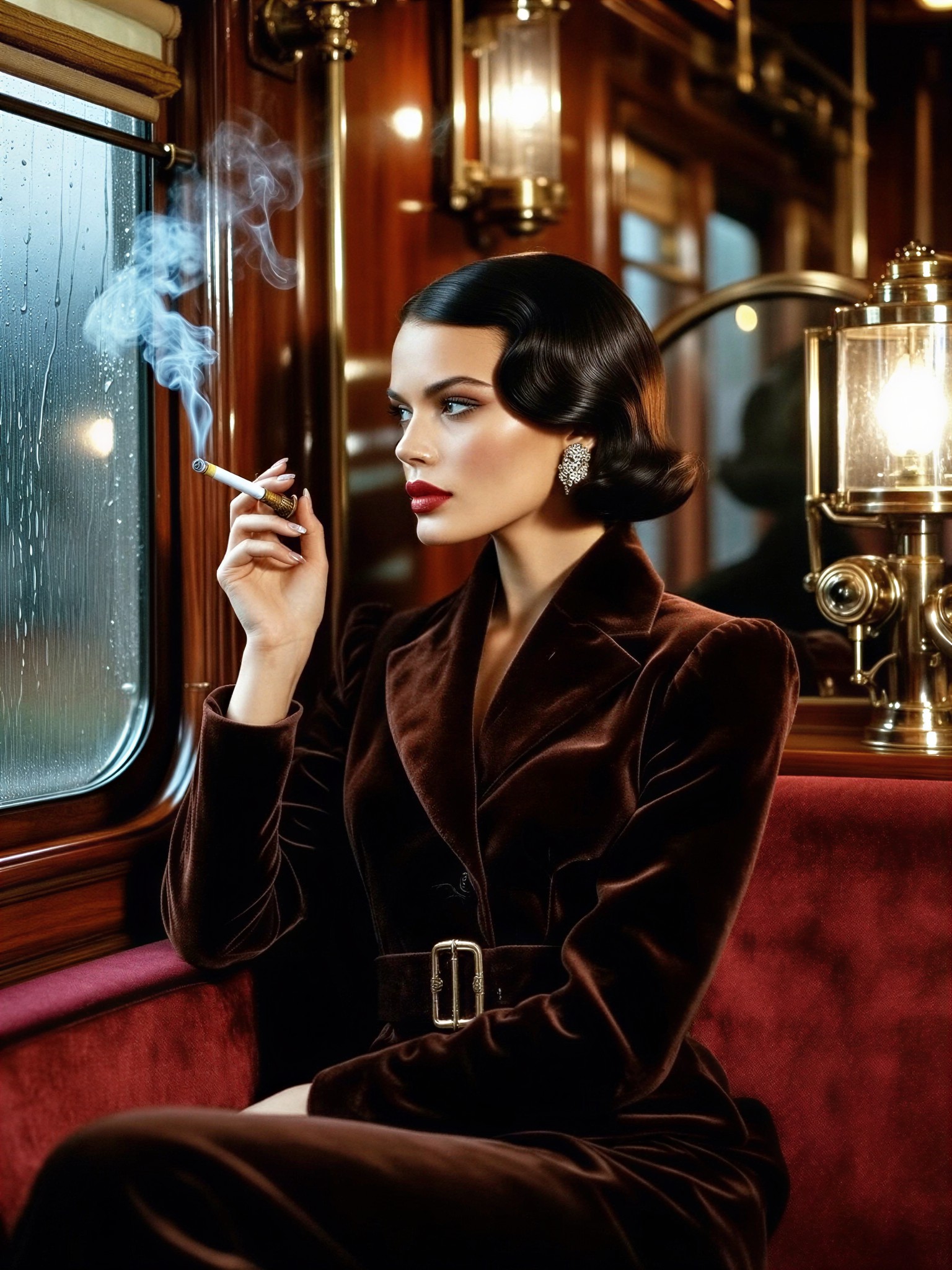 Steampunk style, combined with Noir Style elements. A sophisticated portrait of a beautiful woman with a sleek, dark finger-wave bob and elegant European features. She is sitting in a luxurious, wood-paneled coupe of a high-speed steam train, looking out the rain-streaked window. She wears a structured velvet tailored jacket with a brass buckle. She holds a thin cigarette in a vintage holder, a swirl of blue smoke catching a beam of low-key lighting from a brass lamp. Deep mahogany, brass, and velvet tones (monochromatic browns and reds). Moody volumetric lighting filling the nebula, visible steam and rain refractions, hyper-detailed fabric and mirror textures, 8k resolution, Unreal Engine render quality.