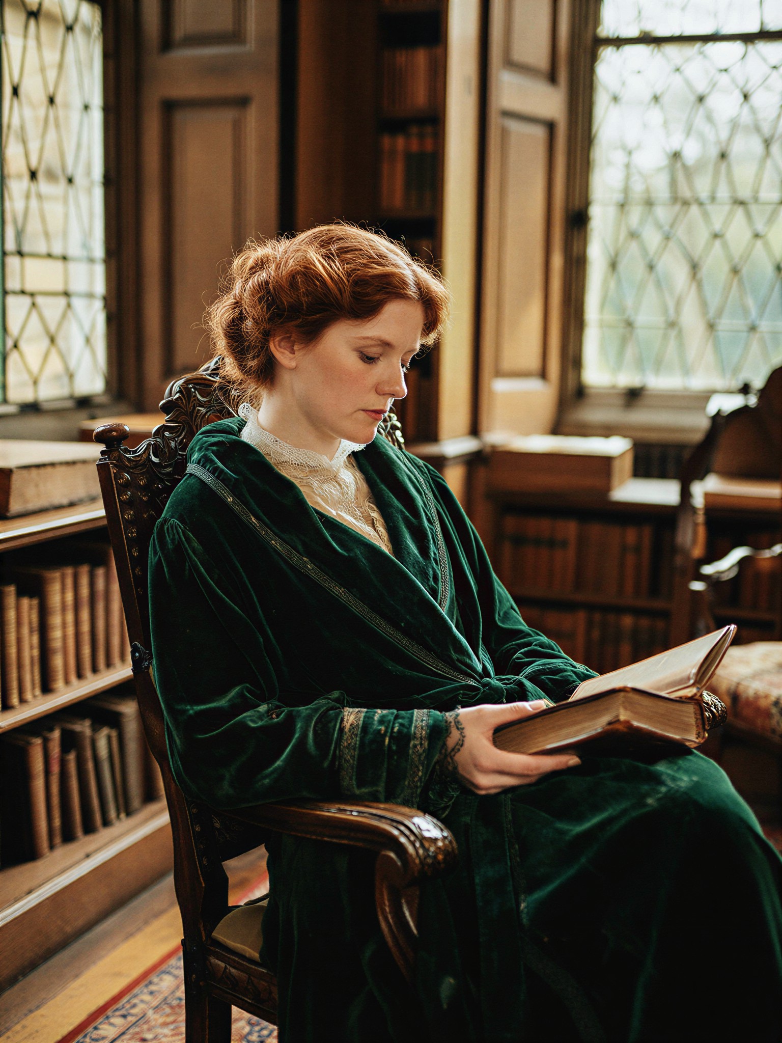 Fine Art Photography, an intimate medium shot of a refined Victorian woman with defined, wavy auburn hair tied in a soft bun. She is sitting in a luxurious, dark oak-paneled library chair by a tall window, wrapped in a heavy, dark emerald velvet robe. She holds an antique leather-bound book. Soft, diffused morning sunlight filters through the leaded glass windows, highlighting the intricate lace details, the worn velvet texture, and the polished wood. Natural low-key lighting (chiaroscuro) fills the room. Highly shallow depth of field, rendering the background of tall bookshelves into a smooth, creamy bokeh. Deep amber and charcoal tones, vintage film aesthetic, 8k.