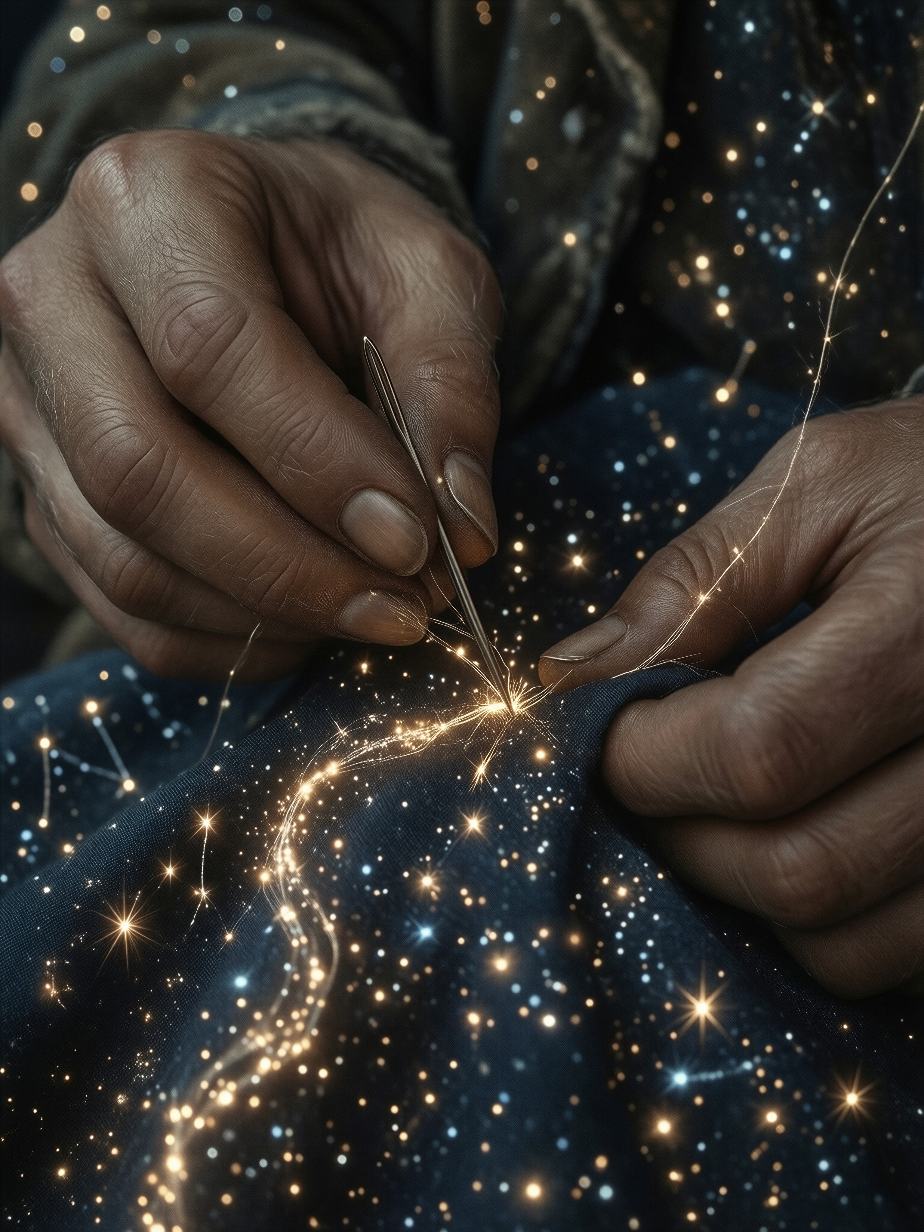 Magical Realism, a close-up shot of an old tailor's weathered hands working with a needle and thread on a piece of dark navy fabric. As he sews, the thread turns into a glowing line of starlight, and the stitches become tiny, shimmering constellations on the cloth. Low-key moody lighting, sharp focus on the glowing thread and skin textures, macro photography details, deep blue and golden color palette, enchanting and grounded, 8k.