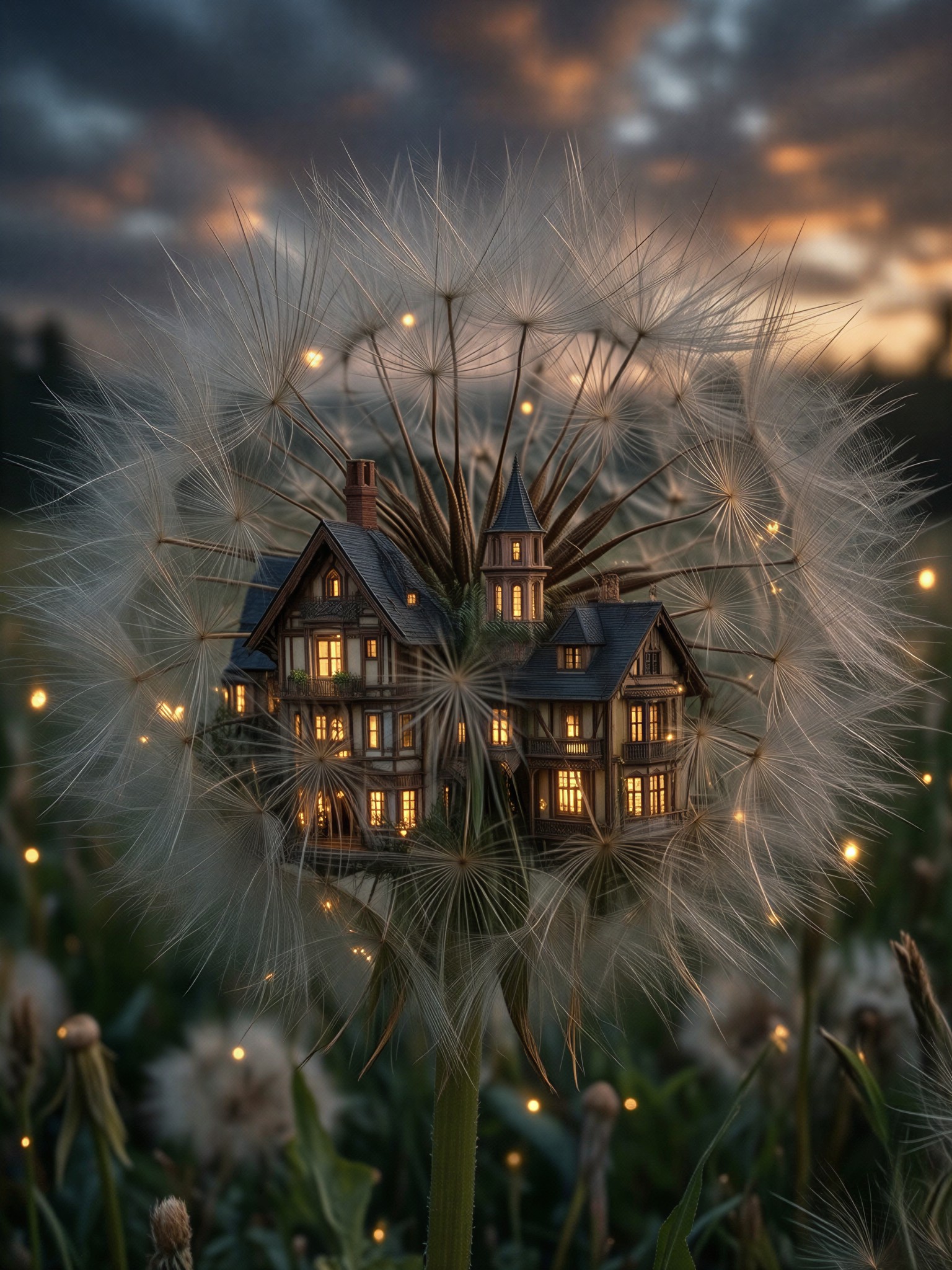 Magical Realism, a breathtaking landscape photo of a vast green meadow at twilight. Instead of normal houses, a tiny, glowing Victorian city is built delicately inside the white fluff of a single, giant dandelion. Tiny windows emit a warm yellow glow. Soft twilight blue and warm orange contrast, macro photography perspective with shallow depth of field, sharp focus on the fragile dandelion seeds and miniature architecture, whimsical and cinematic, masterpiece quality.