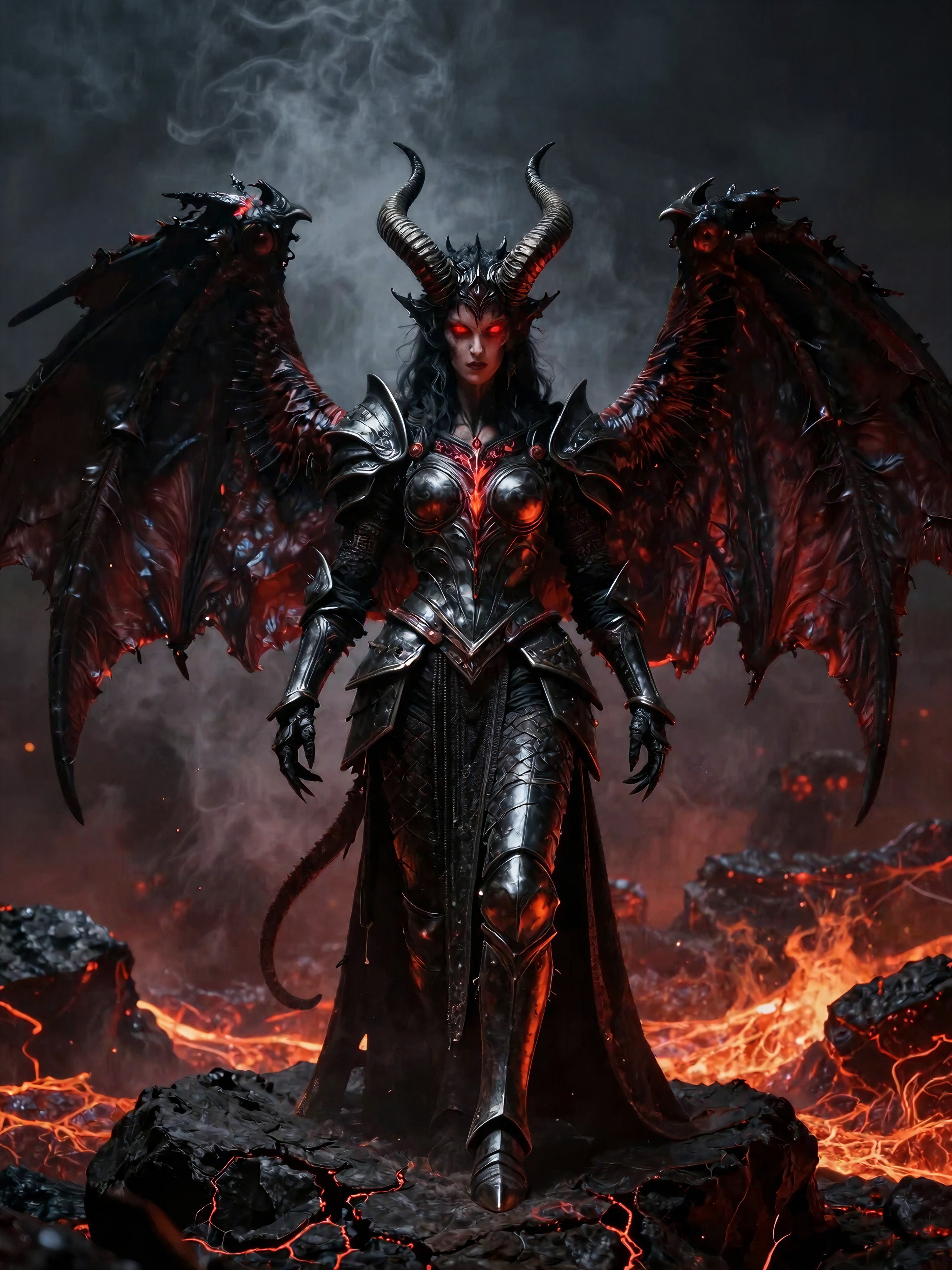 Obsidian Armor and Crimson Fire: The Demoness in Lava-Lit Darkness