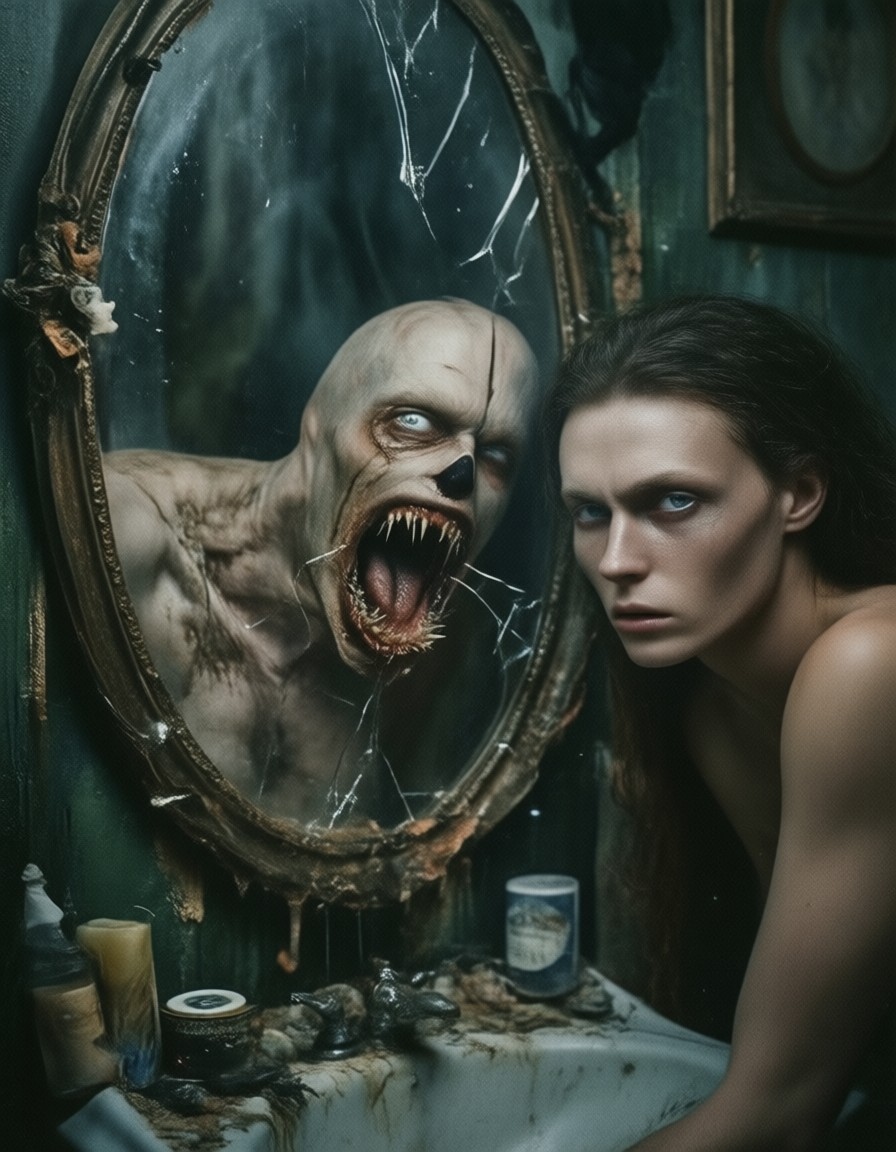 The contrast between the smooth, human face and the grotesque reflection is the heart of the horror. It's not just a nightmare — it's a psychological unraveling, a visual manifestation of the terror that comes when the mirror shows you something you're not ready to see.